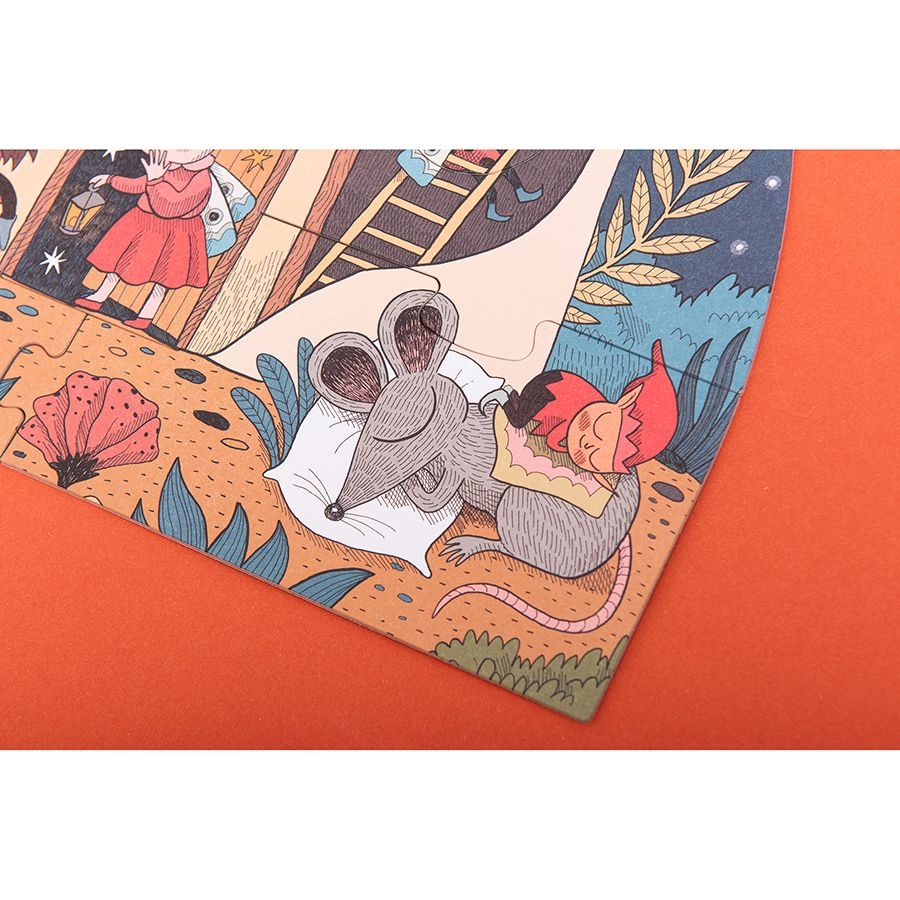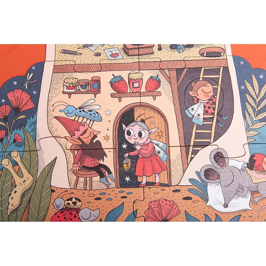 Σσσς, κάντε ησυχία! Η νεράιδα του ύπνου έφτασε και σας εύχεται όνειρα γλυκά! Συναρμολογήστε το παζλ 18 κομματιών. Από τη μία πλευρά απεικονίζεται το εξωτερικό του μαγικού μανιταριού στο οποίο έχει δημιουργήσει το σπίτι της η μικρή νεράιδα, ενώ από την άλλη, το εσωτερικό του όπου θα ανακαλύψετε όλους τους κοιμισμένους φίλους της.