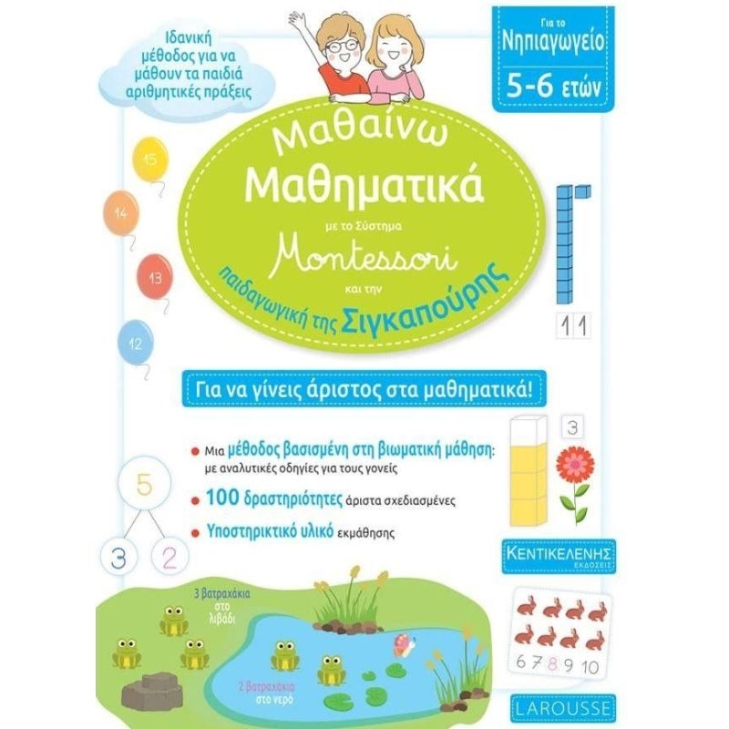 Το βιβλίο αυτό προτείνει περισσότερες από 100 δραστηριότητες οι οποίες βασίζονται στο σύστημα Montessori και την παιδαγωγική της Σιγκαπούρης. Η παιδαγωγική μέθοδος της Σιγκαπούρης στα μαθηματικά είναι παγκοσμίως αναγνωρισμένη Στόχος είναι τα παιδιά να αγαπήσουν τα Μαθηματικά. Το παιδί χρησιμοποιεί συγκεκριμένα αντικείμενα και σταδιακά αντιλαμβάνεται έννοιες όπως της ποσότητας Εδραιώνει την μάθηση και μαθαίνει να χρησιμοποιεί τα σύμβολα των μαθηματικών Ανακαλύπτει νέες έννοιες και μαθαίνει να εκφράζει με λέξεις την λογική του σκέψη Το παιδί αναπαριστά συμβολικά τις μαθηματικές καταστάσεις και τους αριθμούς και εισάγεται στις έννοιες των αριθμητικών πράξεων Στο βιβλίο περιλαμβάνεται υποστηρικτικό υλικό.
