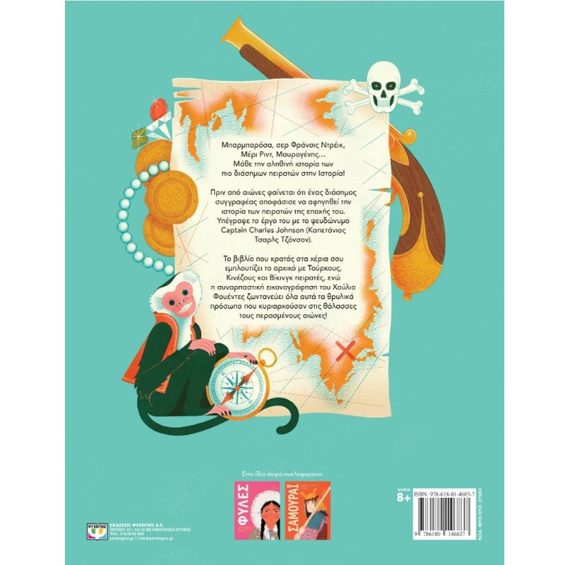 Μπαρμπαρόσα, σερ Φράνσις Ντρέικ, Μέρι Ριντ, Μαυρογένης… Μάθε την αληθινή ιστορία των πιο διάσημων πειρατών στην Ιστορία! Πριν από αιώνες φαίνεται ότι ένας διάσημος συγγραφέας αποφάσισε να αφηγηθεί την ιστορία των πειρατών της εποχής του. Υπέγραψε το έργο του με το ψευδώνυμο Captain Charles Johnson (Καπετάνιος Τσαρλς Τζόνσον). Το βιβλίο που κρατάς στα χέρια σου εμπλουτίζει το αρχικό με Τούρκους, Κινέζους και Βίκινγκ πειρατές, ενώ η συναρπαστική εικονογράφηση του Χούλιο Φουέντες ζωντανεύει όλα αυτά τα θρυλικά πρόσωπα που κυριαρχούσαν στις θάλασσες τους περασμένους αιώνες!