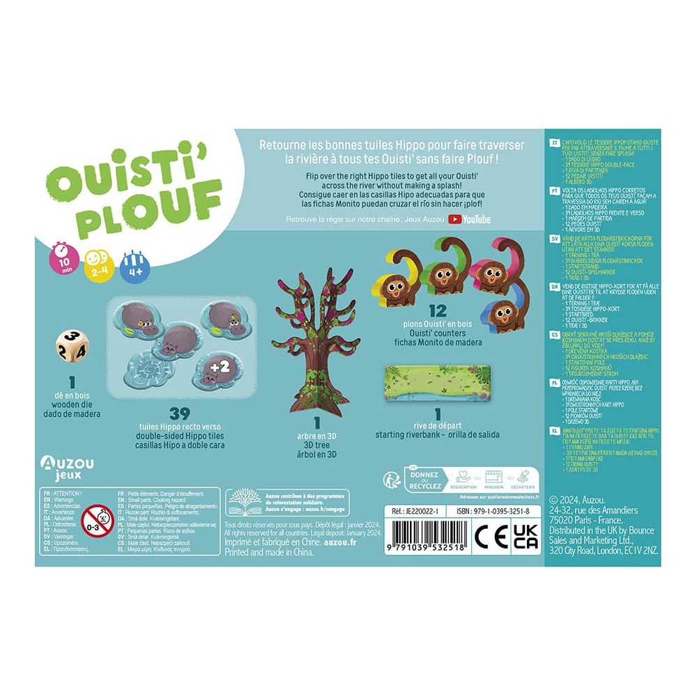 Περιλαμβάνει: 1 ξύλινο ζάρι, 39 ιπποποταμάκια διπλής όψεως, 12 πιόνια-μαϊμουδάκια, 1 τρισδιάστατο δέντρο, 1 κομμάτι έναρξης-ποτάμι και οδηγίες στα ελληνικά.