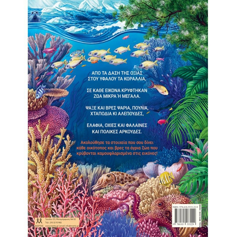 Από τα δάση της οξιάς στου υφάλου τα κοράλλια, σε κάθε εικόνα κρύφτηκαν ζώα μικρά ή μεγάλα. Ψάξε και βρες ψάρια, πουλιά, χταπόδια κι αλεπούδες, ελάφια, οχιές και φάλαινες και πολικές αρκούδες. Ακολούθησε τα στοιχεία που σου δίνει κάθε οικότοπος και βρες τα άγρια ζώα που κρύβονται καμουφλαρισμένα στις εικόνες! Εξερεύνησε έξι οικότοπους του πραγματικού κόσμου: τη Σαχάρα, τα Βραχώδη Όρη, τα Ευρωπαϊκά δάση οξιάς, τη λεκάνη του Αμαζονίου, τον Μεγάλο Κοραλλιογενή Ύφαλο και το αρχιπέλαγος Σβάλμπαρντ. Λύσε τα αινίγματα που θα βρεις στις σελίδες αυτού του βιβλίου, ανακάλυψε ζώα που επιβιώνουν χάρη στο ΧΡΩΜΑ, το MOTIBO ή τη ΣΥΜΠΕΡΙΦΟΡΑ τους, και ύστερα γύρνα σελίδα για να μάθεις περισσότερες πληροφορίες.