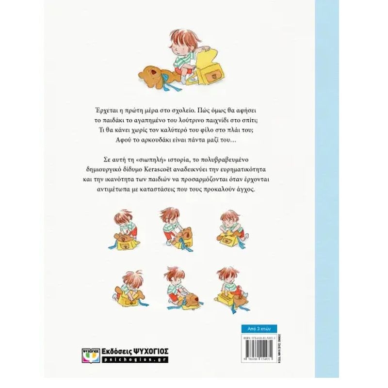 Έρχεται η πρώτη μέρα στο σχολείο. Πώς όμως θα αφήσει το παιδάκι το αγαπημένο του λούτρινο παιχνίδι στο σπίτι; Τι θα κάνει χωρίς τον καλύτερο του φίλο στο πλάι του; Αφού το αρκουδάκι είναι πάντα μαζί του…Σε αυτή τη «σιωπηλή» ιστορία, το πολυβραβευμένο δημιουργικό δίδυμο Kerascoët αναδεικνύει την ευρηματικότητα και την ικανότητα των παιδιών όταν έρχονται αντιμέτωπα με καταστάσεις που τους προκαλούν άγχος.