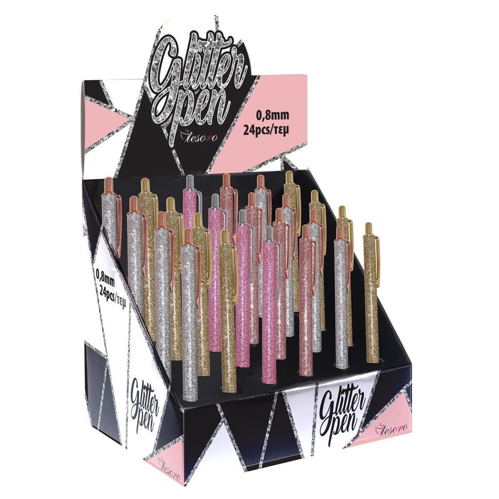 Το Στυλό με στέλεχος Glitter από την Tesoro, είναι ένα ιδανικό αξεσουάρ γραφής με σχέδιο και εμφάνιση που εντυπωσιάζει και δίνει στυλ σε κάθε σημείωση! Κατάλληλη επιλογή δώρου που θα ενθουσιάσει! Διατίθεται σε 4 διαφορετικά χρώματα glitter (Χρυσό, ασημένιο, ροζ και μπρονζέ).