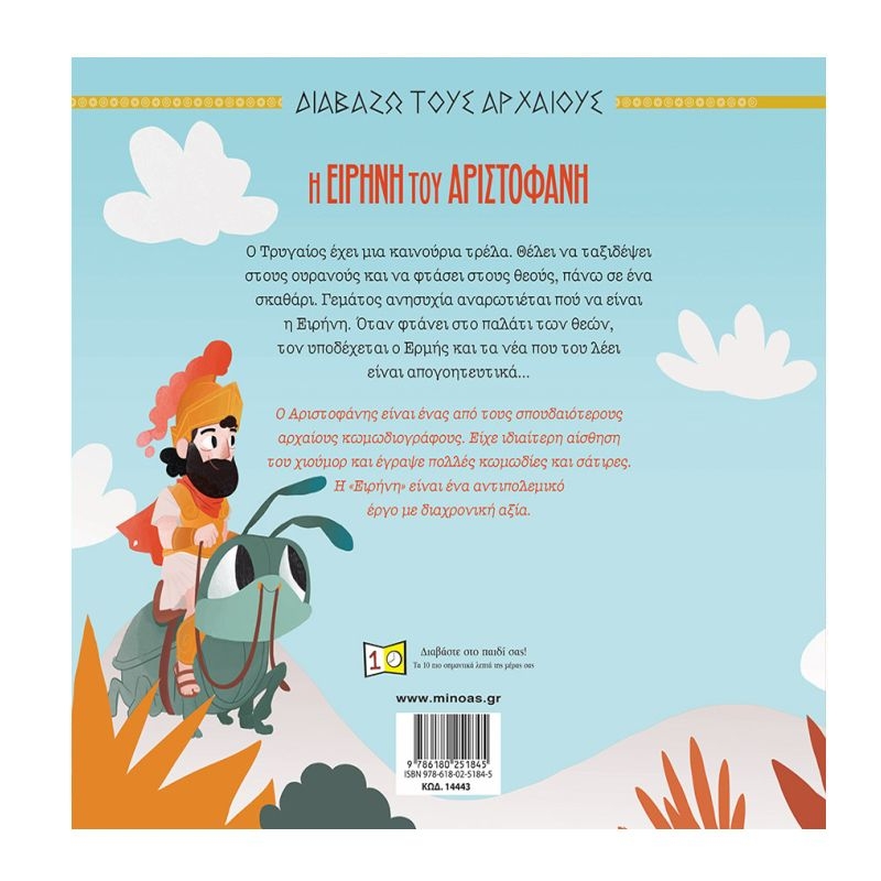 Ο Τρυγαίος έχει μια καινούρια τρέλα. Θέλει να ταξιδέψει στους ουρανούς και να φτάσει στους θεούς, πάνω σε ένα σκαθάρι. Γεμάτος ανησυχία αναρωτιέται πού να είναι η Ειρήνη. Όταν φτάνει στο παλάτι των θεών, τον υποδέχεται ο Ερμής και τα νέα που του λέει είναι απογοητευτικά…Ο Αριστοφάνης είναι ένας από τους σπουδαιότερους αρχαίους κωμωδιογράφους. Είχε ιδιαίτερη αίσθηση του χιούμορ και έγραψε πολλές κωμωδίες και σάτιρες. Η «Ειρήνη» είναι ένα αντιπολεμικό έργο με διαχρονική αξία.