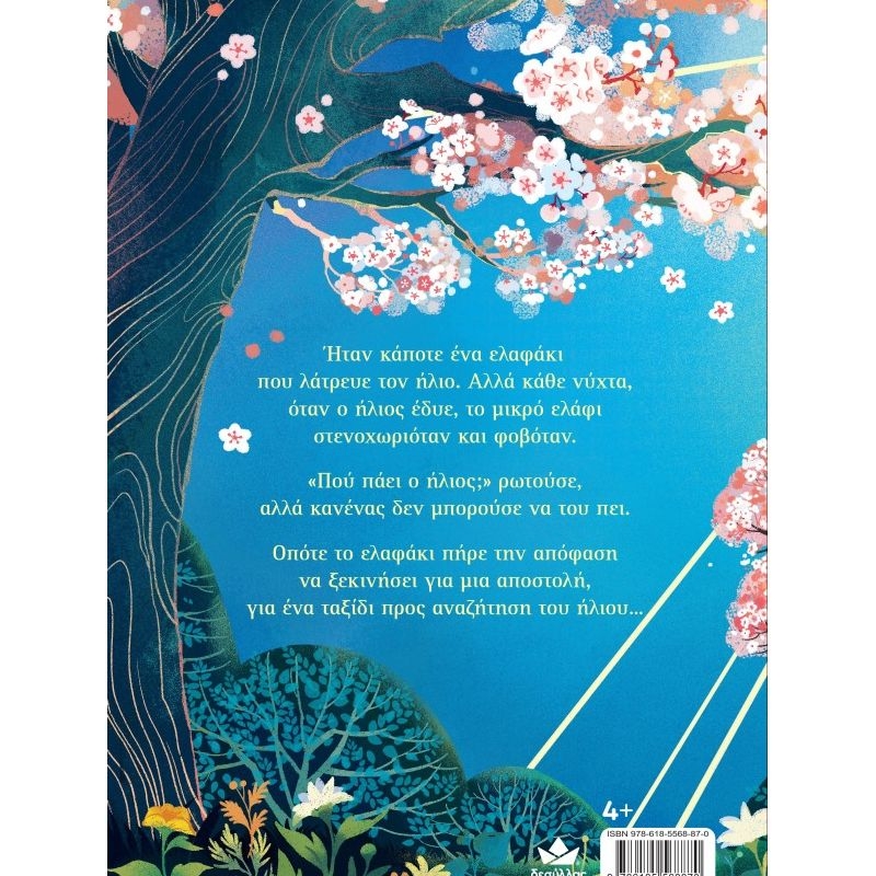 Ήταν κάποτε ένα ελαφάκι που λάτρευε τον ήλιο. Αλλά κάθε νύχτα, όταν ο ήλιος έδυε, το μικρό ελάφι στεναχωριόταν και φοβόταν. «Που πάει ο ήλιος;» ρωτούσε αλλά κανένας δεν μπορούσε να του πει. Οπότε το ελαφάκι πήρε την απόφαση να ξεκινήσει για μια αποστολή, για ένα ταξίδι προς αναζήτηση του ήλιου…Ένα ανακαλυπτικό ταξίδι που θα δυναμώσει και θα ωριμάσει την καρδιά και το μυαλό!