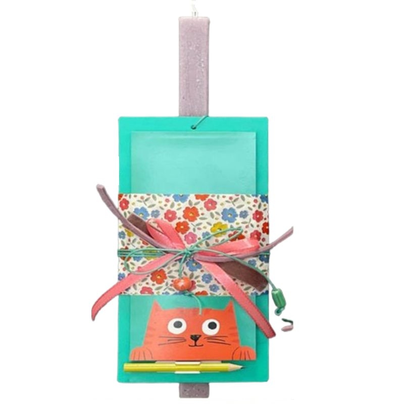 Πασχαλινή χειροποίητη λαμπάδα διακοσμημένη με ένα σημειωματάριο σε σχήμα γάτας, ένα μολύβι, μία χάντρα και πολύχρωμα κορδόνια. Κρατήστε μικρά μυστικά, σημειώσεις και σκαριφήματα κρυμμένα σε αυτό το μαγνητικό σημειωματάριό. Η κάθε λαμπάδα διατίθεται μέσα στη δική της υπέροχη οικολογική συσκευασία!