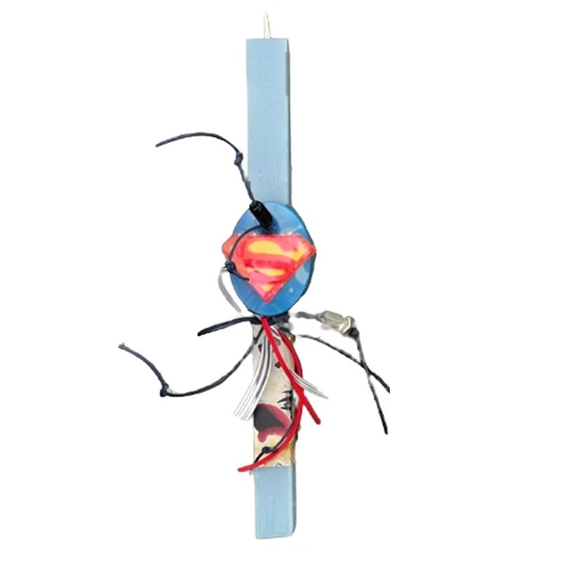 Πασχαλινή χειροποίητη λαμπάδα διακοσμημένη με ένα σαπουνάκι με το σήμα του Superman, μία χάντρα και πολύχρωμα κορδόνια. Η κάθε λαμπάδα διατίθεται μέσα στη δική της υπέροχη οικολογική συσκευασία!
