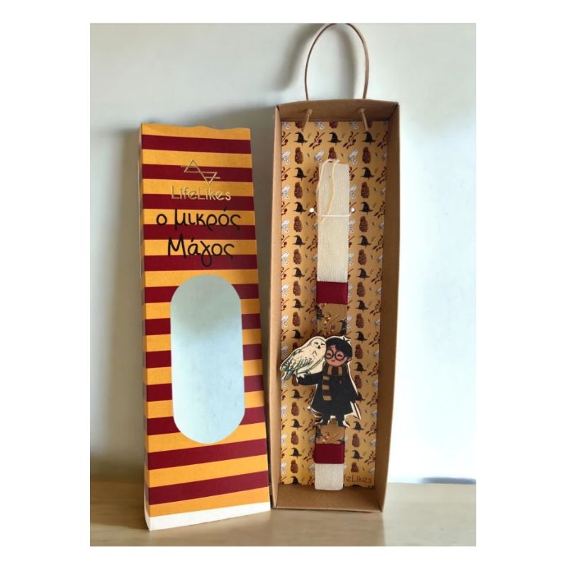 Εμπνευσμένη από έναν μαγικό κόσμο γεμάτη ξόρκια και μυθικά πλάσματα, δημιουργήσαμε τη χειροποίητη λαμπάδα με τον αγαπημένο μικρό μάγο που θα ενθουσιάσει τους μικρούς λάτρεις του παραμυθιού! Το ξύλινο μαγνητάκι, πάνω στη λαμπάδα, αφαιρείται εύκολα. Η λαμπάδα βρίσκεται μέσα σε συρταρωτό κουτί με αντίστοιχο σχεδιασμό και χρυσοτυπία. Τελειοποίησε το δώρο σου, προσθέτοντας το όνομα του παιδιού επάνω στη λαμπάδα και μια όμορφη ευχετήρια κάρτα!