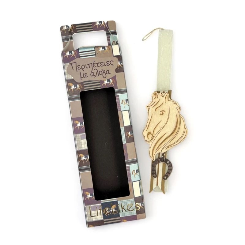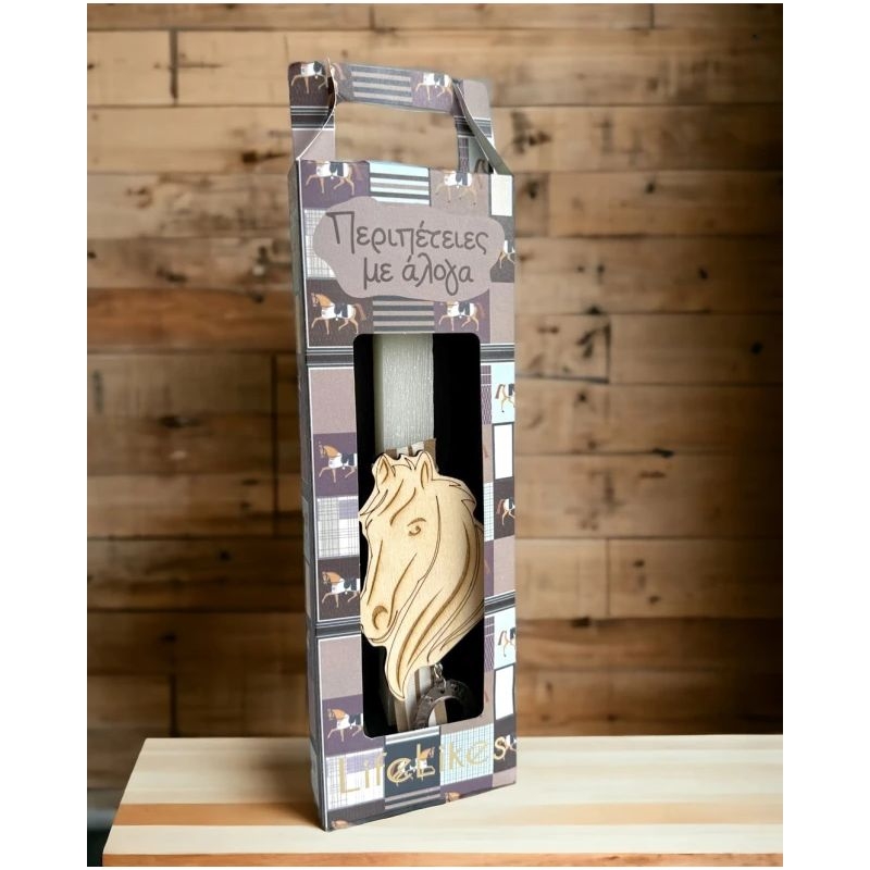 Αυτή η χειροποίητη λαμπάδα είναι η κατάλληλη επιλογή για τους λάτρεις της ιππασίας! Αυτή η μοναδική λαμπάδα φιλοξενείται μέσα σε συρταρωτό κουτί με αντίστοιχο σχεδιασμό, προσφέροντας ένα αξιομνημόνευτο δώρο για κάθε παιδί που λατρεύει την ιππασία. Η ξύλινη φιγούρα του αλόγου είναι μαγνητάκι και αφαιρείται εύκολα. Τελειοποίησε το δώρο σου, προσθέτοντας μια όμορφη ευχετήρια κάρτα και το όνομα του παιδιού επάνω στη λαμπάδα!