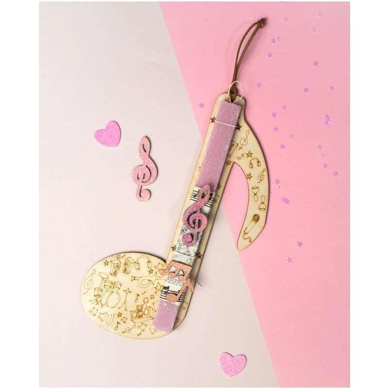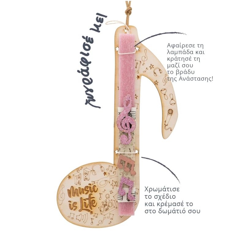 Αυτή η πασχαλινή λαμπάδα έχει σχεδιαστεί για όσους αγαπάνε τη μουσική! Σε υπέροχη ροζ απόχρωση «φιλοξενείται» επάνω σε μια ξύλινη κατασκευή σε ασορτί σχέδιο που στη συνέχεια μπορείς να κρεμάσεις στον τοίχο σου. Επιπλέον, μια από τις νότες είναι μαγνητάκι για να το κολλήσεις επάνω στο ψυγείο ή όπου αλλού εσύ θέλεις και να το έχεις μαζί σου όλο το χρόνο.