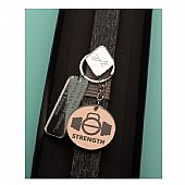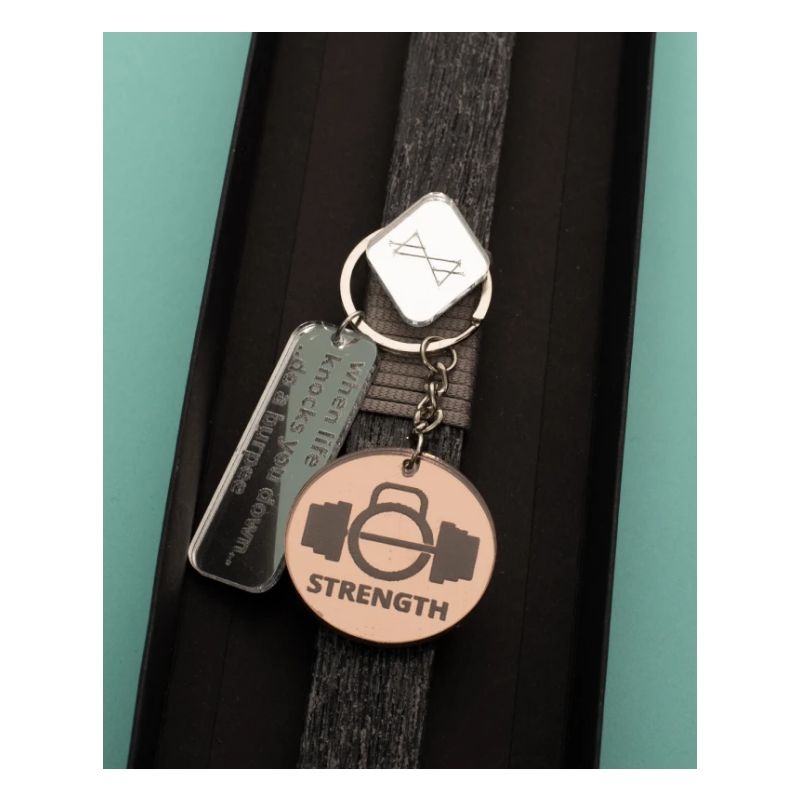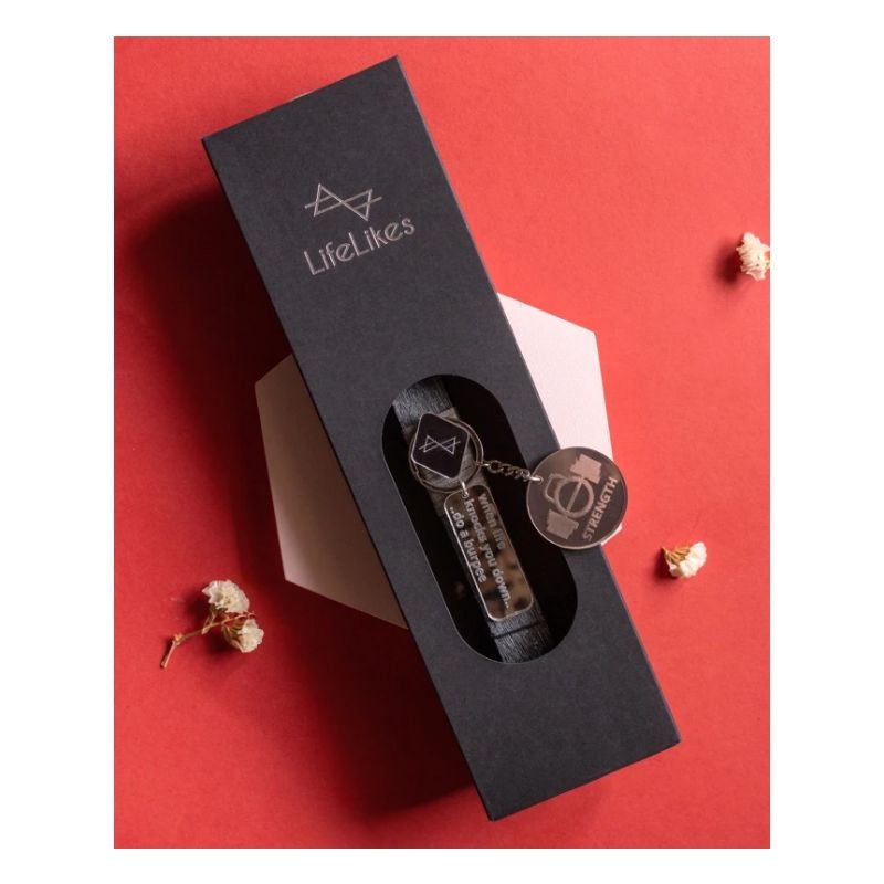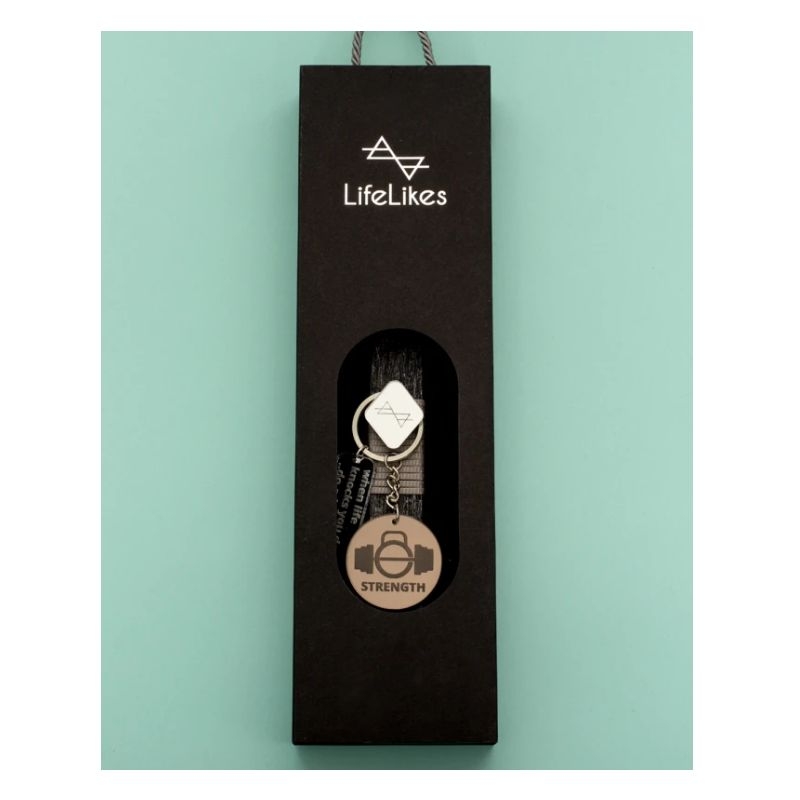 Λαμπάδα Lifelikes με μπρελόκ με κρεμαστά plexiglass στοιχεία χαραγμένα με μηνύματα σχετικά με την δύναμη της άρσης βαρών. Η λαμπάδα "φιλοξενείται" μέσα σε μαύρο συρταρωτό κουτί με ιδιαίτερο σχεδιασμό.
