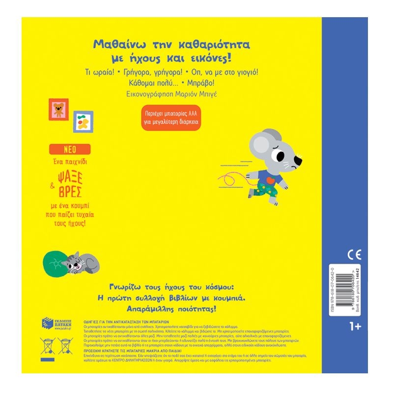 Και στο τέλος, ένα παιχνίδι αναζήτησης και εύρεσης ήχου με ένα κουμπί-έκπληξη! Το παιδί πατάει το κουμπί και δείχνει την εικόνα που ακούει. Πατάει ξανά και ψάχνει σε ποια εικόνα αντιστοιχεί ο νέος ήχος και αυτό, όσες φορές θέλει!