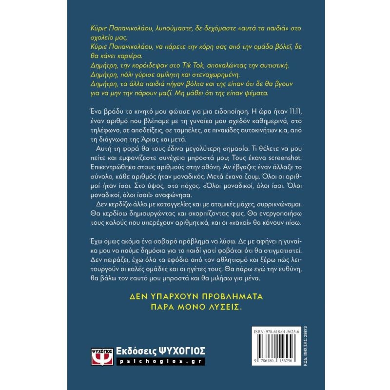 Κύριε Παπανικολάου, λυπούμαστε, δε δεχόμαστε «αυτά τα παιδιά» στο σχολείο μας. Κύριε Παπανικολάου, να πάρετε την κόρη σας από την ομάδα βόλεϊ, δε θα κάνει καριέρα. Δημήτρη, την κορόιδεψαν στο Tik Tok, αποκαλώντας την αυτιστική. Δημήτρη, πάλι γύρισε αμίλητη και στεναχωρημένη. Δημήτρη, τα άλλα παιδιά πήγαν βόλτα και της είπαν ότι δε θα βγουν για να μην την πάρουν μαζί. Μη μάθει ότι της είπαν ψέματα. Ένα βράδυ το κινητό μου φώτισε για μια ειδοποίηση. Η ώρα ήταν 11:11, έναν αριθμό που βλέπαμε με τη γυναίκα μου σχεδόν καθημερινά, στο τηλέφωνο, σε αποδείξεις, σε ταμπέλες, σε πινακίδες αυτοκινήτων κ.α, από τη διάγνωση της Άριας και μετά. Αυτή τη φορά θα τους έδινα μεγαλύτερη σημασία. Τι θέλετε να μου πείτε και εμφανίζεστε συνέχεια μπροστά μου; Τους έκανα screenshot. Επικεντρώθηκα στους αριθμούς στην οθόνη. Αν έβγαζες έναν άλλαζε το σύνολο, κάθε αριθμός ήταν μοναδικός. Μετά έκανα ζουμ. Όλοι οι αριθμοί ήταν ίσοι. Στο ύψος, στο πάχος. «Όλοι μοναδικοί, όλοι ίσοι. Όλοι μοναδικοί, όλοι ίσοι!» αναφώνησα. Δεν κερδίζω άλλο με καταγγελίες και με ατομικές μάχες, συρρικνώνομαι. Θα κερδίσω δημιουργώντας και σκορπίζοντας φως. Θα ενεργοποιήσω τους καλούς που υπερέχουν αριθμητικά, και οι «κακοί» θα κάνουν πίσω. Έχω όμως ακόμα ένα σοβαρό πρόβλημα να λύσω. Δε με αφήνει η γυναίκα μου να πούμε δημόσια για το παιδί γιατί φοβάται ότι θα στιγματιστεί. Δεν πειράζει, έχω όλα τα εφόδια από τον αθλητισμό και ξέρω πώς λειτουργούν οι καλές ομάδες και οι ηγέτες τους. Θα πάρω εγώ την ευθύνη, θα βάλω τον εαυτό μου μπροστά και θα μιλήσω για μένα. ΔΕΝ ΥΠΑΡΧΟΥΝ ΠΡΟΒΛΗΜΑΤΑ ΠΑΡΑ ΜΟΝΟ ΛΥΣΕΙΣ.