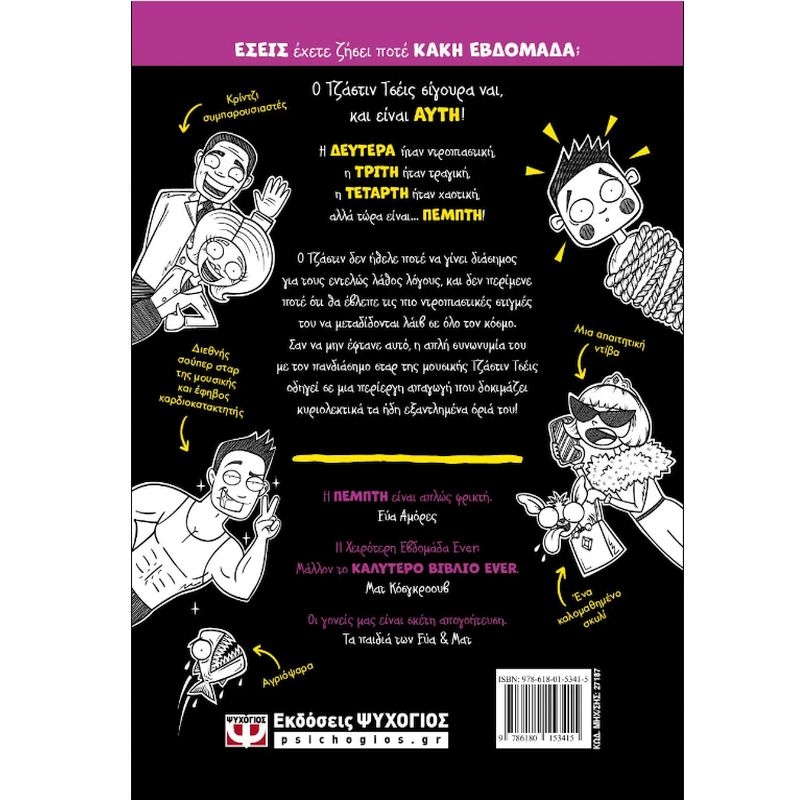 ΕΣΕΙΣ έχετε ζήσει ποτέ ΚΑΚΗ ΕΒΔΟΜΑΔΑ; Ο Τζάστιν Τσέις σίγουρα ναι, και είναι ΑΥΤΗ! Η ΔΕΥΤΕΡΑ ήταν ντροπιαστική, η ΤΡΙΤΗ ήταν τραγική, η ΤΕΤΑΡΤΗ ήταν χαοτική αλλά τώρα είναι… ΠΕΜΠΤΗ! Ο Τζάστιν δεν ήθελε ποτέ να γίνει διάσημος για τους εντελώς λάθος λόγους, και δεν περίμενε ποτέ ότι θα έβλεπε τις πιο ντροπιαστικές στιγμές του να μεταδίδονται λάιβ σε όλο τον κόσμο. Σαν να μην έφτανε αυτό, η απλή συνωνυμία του με τον πανδιάσημο σταρ της μουσικής Τζάστιν Τσέις οδηγεί σε μια περίεργη απαγωγή που δοκιμάζει κυριολεκτικά τα ήδη εξαντλημένα όρια του!
