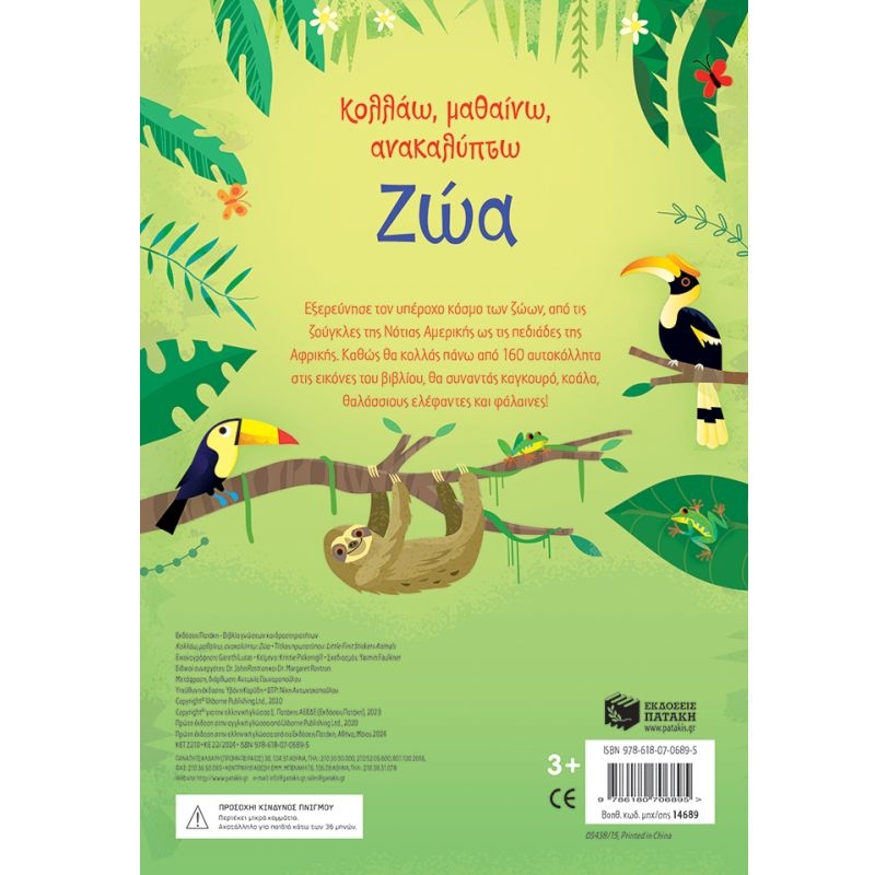 Εξερεύνησε τον υπέροχο κόσμο των ζώων, από τις ζούγκλες της Νότιας Αμερικής ως τις πεδιάδες της Αφρικής. Καθώς θα κολλάς πάνω από 160 αυτοκόλλητα στις εικόνες του βιβλίου, θα συναντάς καγκουρό, κοάλα, θαλάσσιους ελέφαντες και φάλαινες!