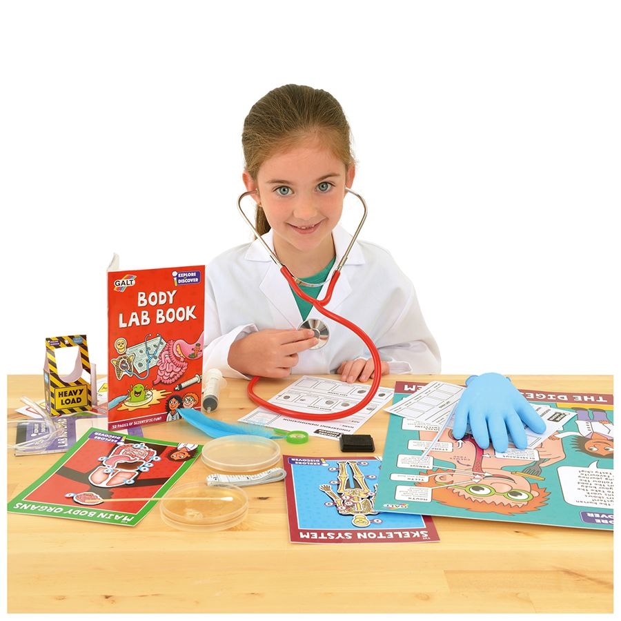 Οι νεαροί γιατροί μπορούν να ακούσουν τον καρδιακό παλμό τους, να μετρήσουν τον αέρα στους πνεύμονές τους αλλά και να δοκιμάσουν τη μυϊκή τους δύναμη. Μπορούν να ανακαλύψουν την αντοχή των μαλλιών τους, να αναλύσουν τα δακτυλικά τους αποτυπώματα καθώς και να μάθουν για τα ωφέλιμα ή τα επιβλαβή βακτήρια που υπάρχουν στο δέρμα μας. Στο «Body Lab» περιλαμβάνονται 14 διασκεδαστικά πειράματα.