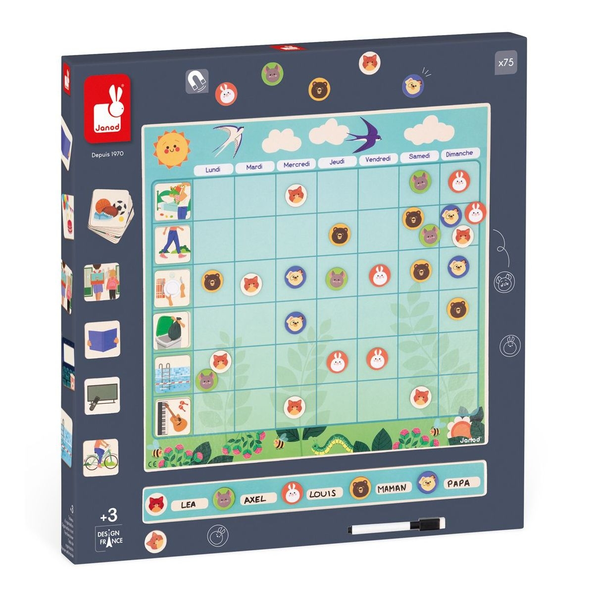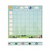 Το οικογενειακό πρόγραμμα γίνεται παιχνιδάκι χάρη σε αυτό το οργανωτικό διάγραμμα με μαγνητάκια, που βοηθά το παιδί σας να διαχειριστεί την εβδομάδα του και να γίνει πιο ανεξάρτητο. Έτσι, δε θα ξεχνάει ποιος θα το πάρει από το σχολείο ή ποια μέρα έχει προπόνηση. Υπάρχει ένα τετραγωνάκι για κάθε μέρα και για κάθε δραστηριότητα, όπου το παιδί σας τοποθετεί ένα ζώο-μαγνητάκι που απεικονίζει το μέλος ή τα μέλη της οικογένειας που συμμετέχουν σε αυτή τη δραστηριότητα. Ο λεπτός (3 χιλ.) και ρυθμιζόμενος μαγνητικός πίνακας είναι κατάλληλος για όλα τα ψυγεία ή οποιαδήποτε άλλη μαγνητική επιφάνεια.