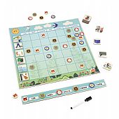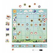 Περιλαμβάνει: 5 διαφορετικά ζώα, σε 11 αντίγραφα το καθένα, 7 αυτοκόλλητα σε 6 γλώσσες για τις μέρες της εβδομάδας και 20 δραστηριότητες-μαγνητάκια, που καλύπτουν από απλές δουλειές του σπιτιού μέχρι δραστηριότητες ελεύθερου χρόνου, όπως αθλήματα, μουσική και γενέθλια, και, φυσικά, τη λήξη της σχολικής χρονιάς. Περιλαμβάνει επίσης έναν στεγνό μαρκαδόρο για να γράφετε το όνομα κάθε προσώπου στο αντίστοιχο τετραγωνάκι. Αυτό το οργανωτικό διάγραμμα είναι ιδανικό για να μπορέσει το παιδί σας να μάθει τις έννοιες του χρόνου και του προγράμματος στην καθημερινότητα.