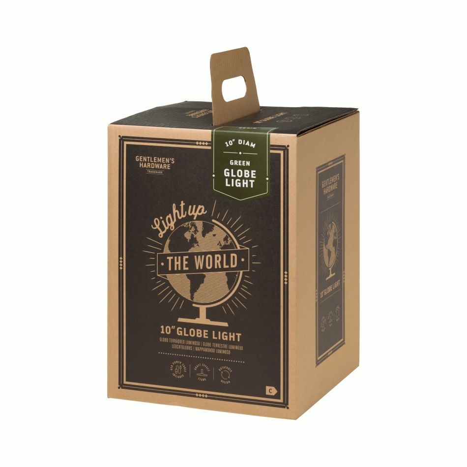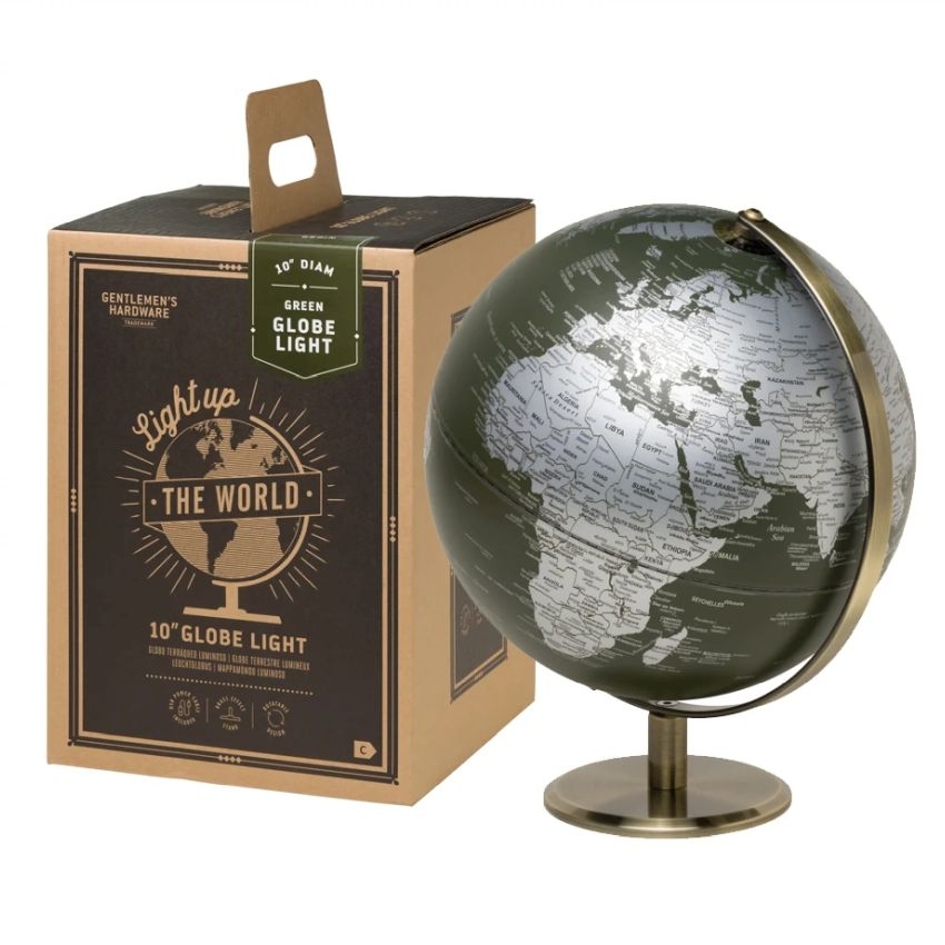 Η ομορφιά της Γης είναι μια ατελείωτη πηγή γοητείας και έμπνευσης. Η εντυπωσιακή υδρόγειος με πράσινο χρώμα στη θέση της θάλασσας, παρέχει φως στο σκοτάδι και σας επιτρέπει να μελετήσετε όλες τις χώρες και τις πόλεις του κόσμου. Η συμπαγής βάση είναι κατασκευασμένη από υψηλής ποιότητας ανοξείδωτο χάλυβα, που εξασφαλίζει τη σταθερότητα της Υδρογείου. Η ομορφιά της Γης είναι μια ατελείωτη πηγή γοητείας και τώρα το Gentlemen’s Hardware έχει μετατρέψει την υδρόγειο σε λάμπα για να στολίσει το γραφείο ή το κομοδίνο σας. Όχι μόνο ανάβει στο σκοτάδι, αλλά μπορεί επίσης να σας διδάξει για τις χώρες και τις πόλεις του κόσμου.. Η βάση της υδρόγειου είναι κατασκευασμένη από ανοξείδωτο χάλυβα, κρατώντας όλο τον κόσμο με ασφάλεια στα χέρια σας και είναι εύκολο να το τοποθετήσετε συνδέοντάς το σε μια πρίζα με καλώδιο Usb. Με τη μεγάλη διάρκεια ζωής και τις σαφείς πληροφορίες για χώρες και πόλεις, αυτή η λάμπα-υδρόγειος είναι ένα πραγματικό στολίδι.