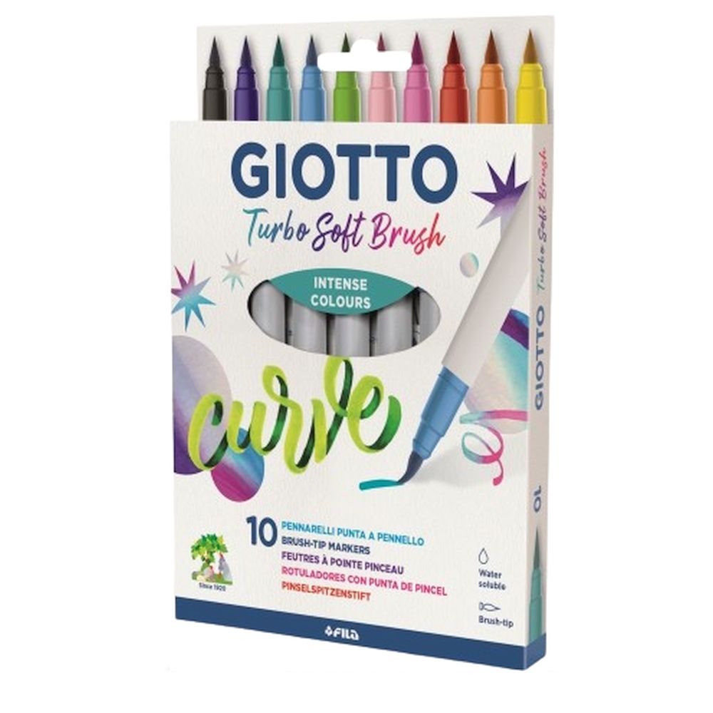 Ο μαρκαδόρος GIOTTO Turbo Soft Brush με μαλακή και εύκαμπτη μύτη πινέλου, σας επιτρέπει να αποκτήσετε μια προσαρμόσιμη γραφή, λεπτή και παχιά, ανάλογα με τις ανάγκες. Το μελάνι έχει βάση το νερό με φωτεινές αποχρώσεις, διαθέσιμο σε 10 φανταστικά χρώματα. Το GIOTTO Turbo Soft Brush είναι ιδανικό για διαφορετικές τεχνικές χρωματισμού, για καλλιγραφία, lettering ή για γράμματα.