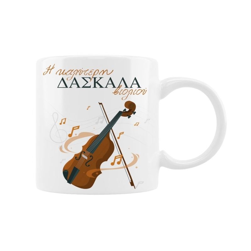 Ψάχνετε το πιο μοναδικό δώρο για την αγαπημένη σας δασκάλα βιολιού; Φτιαγμένη από υψηλής ποιότητας πορσελάνη, αυτή η ιδιαίτερη κούπα είναι ιδανική για να απολαμβάνει τον καφέ, το τσάι ή το αγαπημένο της ρόφημα με χαμόγελο, κάθε φορά που τη χρησιμοποιεί. Το σχέδιο διαθέτει ένα όμορφο βιολί με νότες. Ιδανική επιλογή δώρου για το κλείσιμο της σχολικής χρονιάς, για τις τελικές εξετάσεις ή για να πείτε απλά «ευχαριστώ».