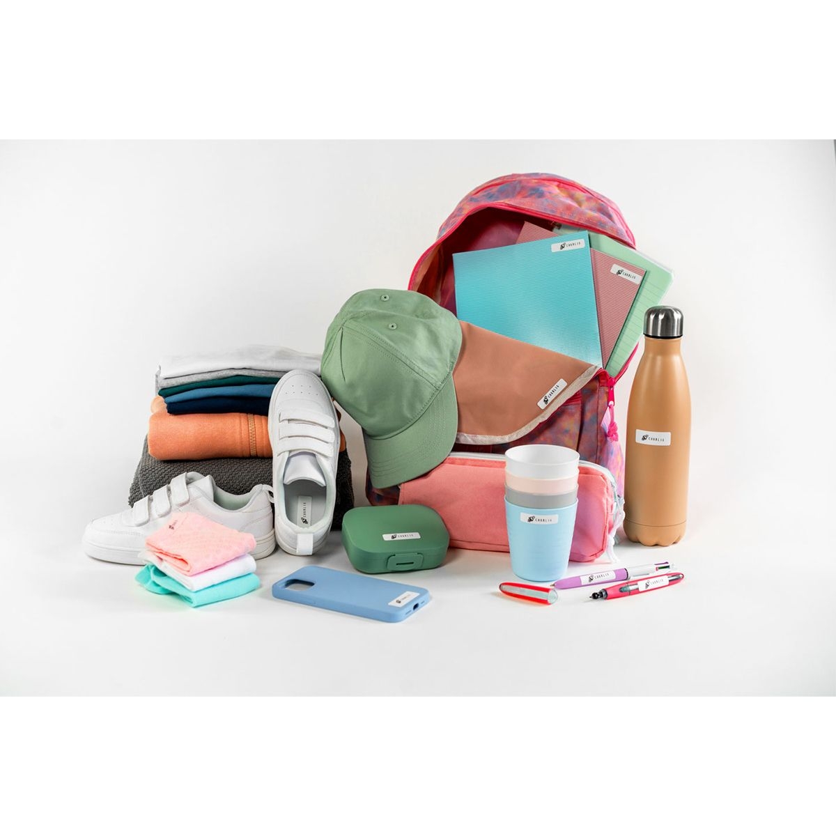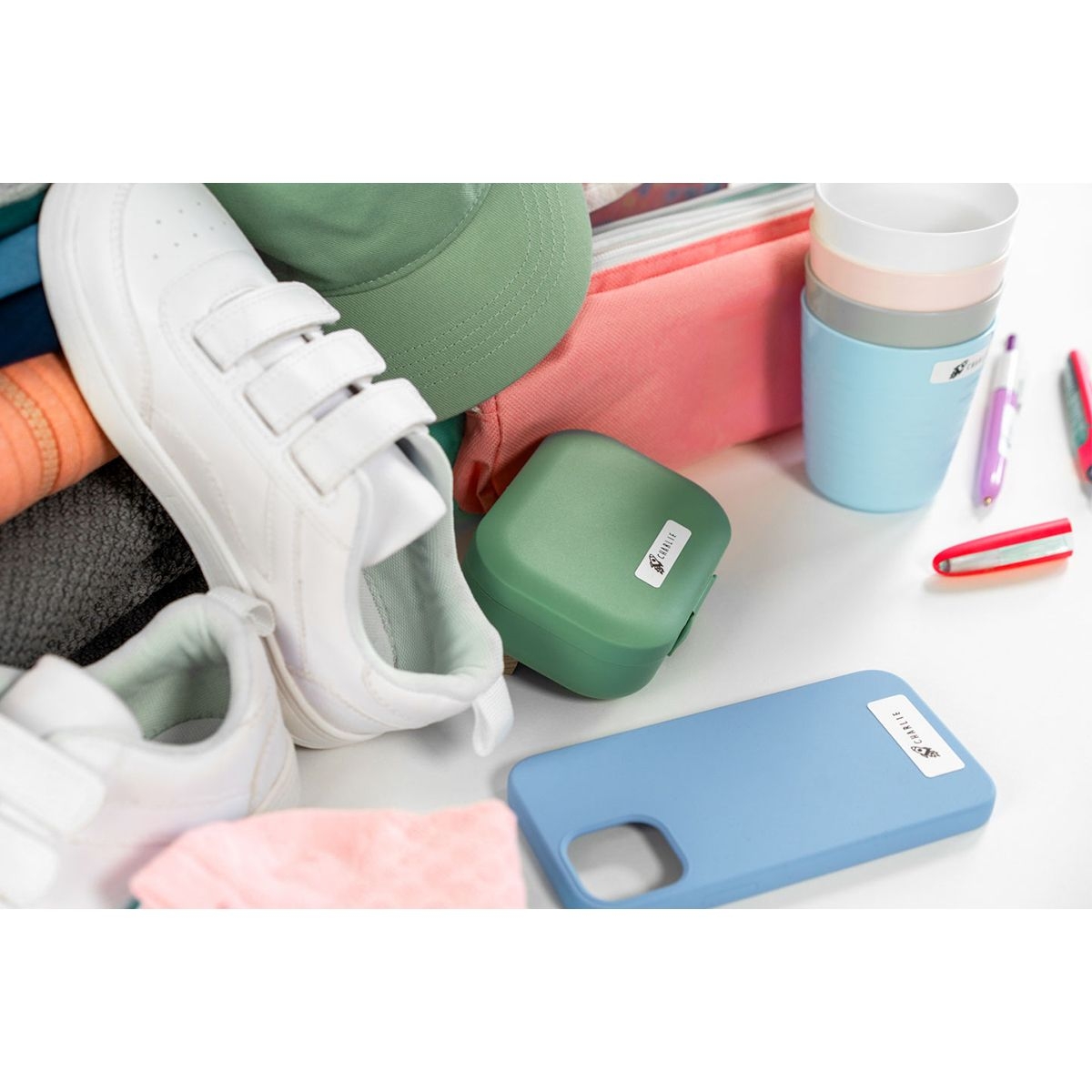 Κάθε σφραγίδα περιλαμβάνει το ειδικό μελάνι σε μαύρο χρώμα που αρκεί για έως 1000 σφραγίδες και μένει πάνω σε όλες τις απορροφητικές επιφάνειες ακόμη και μετά από το πλύσιμο. Θέλετε να σταμπάρετε ακόμη και μη απορροφητικές επιφάνειες, όπως μπουκάλια, τάπερ ή κασετίνες; Κανένα πρόβλημα. Οι ειδικές ετικέτες θα σας βοηθήσουν να το πετύχετε.
