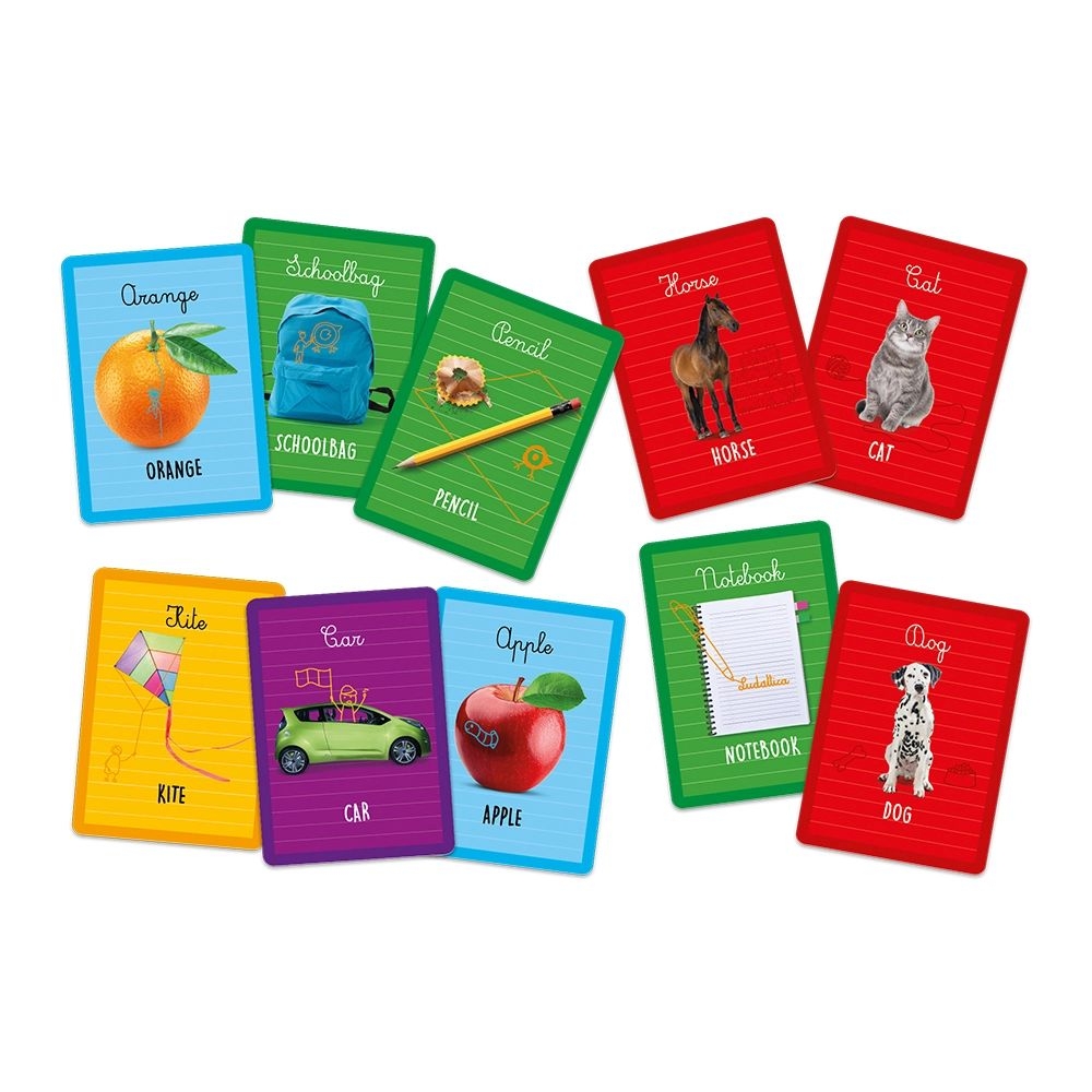 Το ιδανικό παιχνίδι για να εισάγεται τα παιδιά στην εκμάθηση της αγγλικής γλώσσας, με τον πιο διασκεδαστικό τρόπο. Χρησιμοποιήστε τις 48 κάρτες της συσκευασίας για να δημιουργήσετε πολλά λεκτικά παιχνίδια και να μάθετε βασικές λέξεις, όπως τις ονομασίες των κατοικίδιων ζώων, των αγαπημένων μας φρούτων, των βασικών σχολικών αντικειμένων και άλλα πολλά.