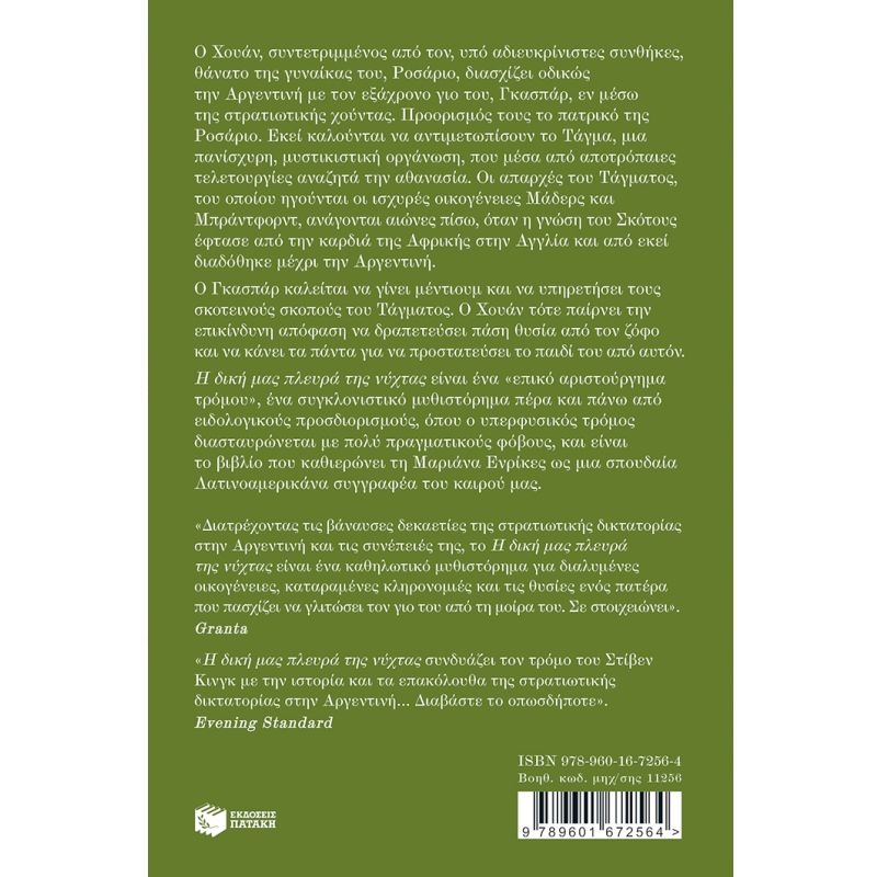 Ο Χουάν, συντετριμμένος από τον, υπό αδιευκρίνιστες συνθήκες, θάνατο της γυναίκας του, Ροσάριο, διασχίζει οδικώς την Αργεντινή με τον εξάχρονο γιο του, Γκασπάρ, εν μέσω της στρατιωτικής χούντας. Προορισμός τους το πατρικό της Ροσάριο. Εκεί καλούνται να αντιμετωπίσουν το Τάγμα, μια πανίσχυρη, μυστικιστική οργάνωση, που μέσα από αποτρόπαιες τελετουργίες αναζητά την αθανασία. Οι απαρχές του Τάγματος, του οποίου ηγούνται οι ισχυρές οικογένειες Μάδερς και Μπράντφορντ, ανάγονται αιώνες πίσω, όταν η γνώση του Σκότους έφτασε από την καρδιά της Αφρικής στην Αγγλία και από εκεί διαδόθηκε μέχρι την Αργεντινή. Ο Γκασπάρ καλείται να γίνει μέντιουμ και να υπηρετήσει τους σκοτεινούς σκοπούς του Τάγματος. Ο Χουάν τότε παίρνει την επικίνδυνη απόφαση να δραπετεύσει πάση θυσία από τον ζόφο και να κάνει τα πάντα για να προστατεύσει το παιδί του από αυτόν. «Η δική μας πλευρά της νύχτας» είναι ένα «επικό αριστούργημα τρόμου», ένα συγκλονιστικό μυθιστόρημα πέρα και πάνω από ειδολογικούς προσδιορισμούς, όπου ο υπερφυσικός τρόμος διασταυρώνεται με πολύ πραγματικούς φόβους, και είναι το βιβλίο που καθιερώνει τη Μαριάνα Ενρίκες ως μια σπουδαία Λατινοαμερικάνα συγγραφέα του καιρού μας. «Διατρέχοντας τις βάναυσες δεκαετίες της στρατιωτικής δικτατορίας στην Αργεντινή και τις συνέπειές της, το 'Η δική μας πλευρά της νύχτας' είναι ένα καθηλωτικό μυθιστόρημα για διαλυμένες οικογένειες, καταραμένες κληρονομιές και τις θυσίες ενός πατέρα που πασχίζει να γλιτώσει τον γιο του από τη μοίρα του.