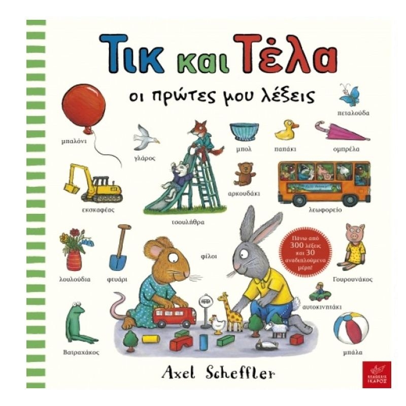 Ένα βιβλίο μεγάλου σχήματος με περισσότερες από 300 λέξεις, ιδανικές για τις πρώτες εξερευνήσεις των μικρών μας φίλων από τον κόσμο των αγαπημένων Τικ και Τέλα. Ετοιμαστείτε για ατέλειωτες ώρες παιχνιδιού, με εκατοντάδες πολύχρωμες εικόνες και λέξεις που ενθαρρύνουν την ομιλία και εμπλουτίζουν το λεξιλόγιο κάθε μικρού παιδιού! Με πολλά γνώριμα αντικείμενα και δέκα συναρπαστικές σκηνές από την καθημερινή ζωή, αυτό το βιβλίο θα παρακινήσει τους μικρούς αναγνώστες να μάθουν τις πρώτες τους λέξεις διασκεδάζοντας. Παράλληλα θα τους κρατήσει αμείωτο το ενδιαφέρον και θα γίνει η ιδανική αφορμή για να φτιάξουν τη δική τους ιστορία.