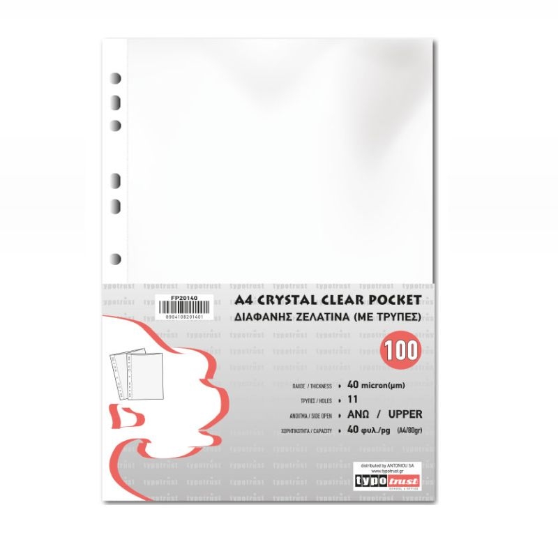Ζελατίνα ενισχυμένη στο πλάι, 0,04mm με 11 οπές για να προσαρμόζεται σε όλα τα κλασέρ και ντοσιέ μεγέθους Α4, με 2,3 ή 4 κρίκους. Άνοιγμα στο πάνω μέρος.