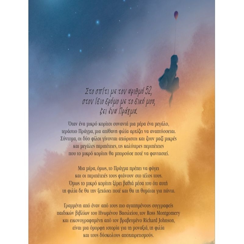 Όταν ένα μικρό κορίτσι συναντά μια μέρα ένα μεγάλο, τεράστιο Πράγμα, μια απίθανη φιλία αρχίζει να αναπτύσσεται. Σύντομα, οι δύο φίλοι γίνονται αχώριστοι και ζουν μαζί μικρές και μεγάλες περιπέτειες, τις καλύτερες περιπέτειες που το μικρό κορίτσι θα μπορούσε ποτέ να φανταστεί. Μια μέρα, όμως, το Πράγμα πρέπει να φύγει και οι περιπέτειές τους φτάνουν στο τέλος τους. Όμως το μικρό κορίτσι ξέρει βαθιά μέσα του ότι αυτή τη φιλία δε θα την ξεχάσει ποτέ και θα τη θυμάται για πάντα. Μια όμορφη ιστορία για τη μοναξιά, τη φιλία και τους δύσκολους αποχαιρετισμούς.