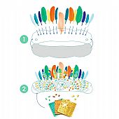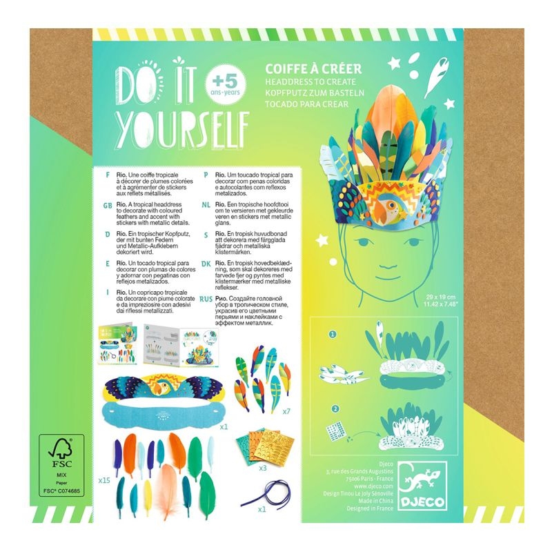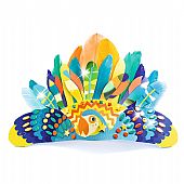 Ένα δημιουργικό σετ για τη δημιουργία ενός τροπικού αξεσουάρ κεφαλιού με πολύχρωμα φτερά και αυτοκόλλητα. Το αξεσουάρ έχει μια αυτοκόλλητη περιοχή μέσα στην οποία μπορεί να τοποθετηθούν τα χρωματιστά φτερά. Μόλις κλείσει, το μόνο που μένει είναι να διακοσμήσετε το αξεσουάρ με μεταλλικά αυτοκόλλητα, σεβόμενοι τους τυπωμένους χρωματικούς κωδικούς, για να δημιουργήσετε το πιο όμορφο τροπικό καπέλο και να ανταγωνιστείτε το Καρναβάλι του Ρίο! Η κατασκευή λόγο των υφασμάτινων στοιχείων του μπορεί να προσαρμοστεί σε οποιαδήποτε περιφέρεια κεφαλιού. Ένα προϊόν κατασκευασμένο από χαρτί και χαρτόνι με πιστοποίηση FSC®.