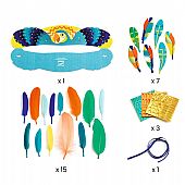 Περιλαμβάνει: 1 αυτοκόλλητο υφασμάτινο κάλυμμα κεφαλής, 15 χρωματιστά συνθετικά φτερά, 7 εικονογραφημένα φτερά με μεταλλικές λεπτομέρειες, 3 σετ αυτοκόλλητα αφρού από μεταλλικό μωσαϊκό και εικονογραφημένες οδηγίες βήμα προς βήμα.