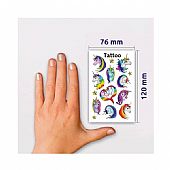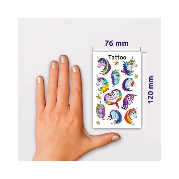 Τατουάζ με 14 μονόκερους και αστέρια σε ένα φύλλο με διαφορετικά μεγέθη. Είναι κατάλληλο για μικρά παιδιά, καθώς είναι οικολογικά και αφαιρούνται εύκολα με νερό και σαπούνι!