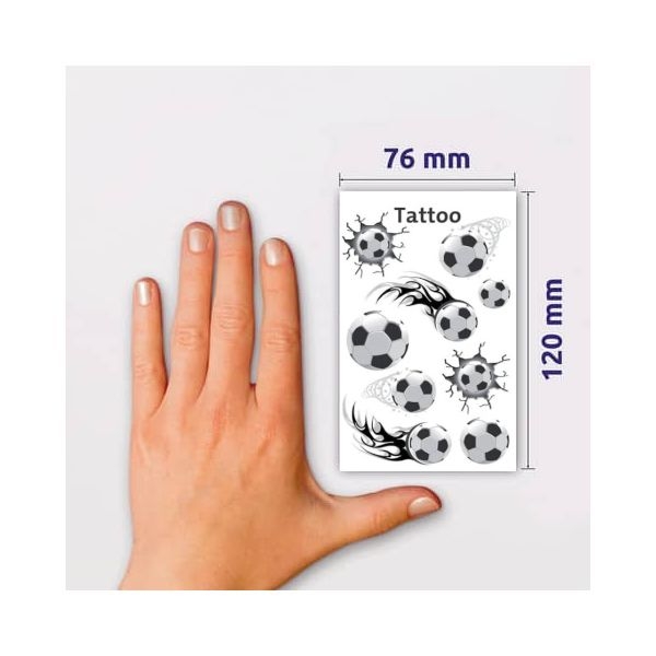 Τατουάζ με 9 μπάλες ποδοσφαίρου σε ένα φύλλο με διαφορετικά μεγέθη. Είναι κατάλληλο για μικρά παιδιά, καθώς είναι οικολογικά και αφαιρούνται εύκολα με νερό και σαπούνι!