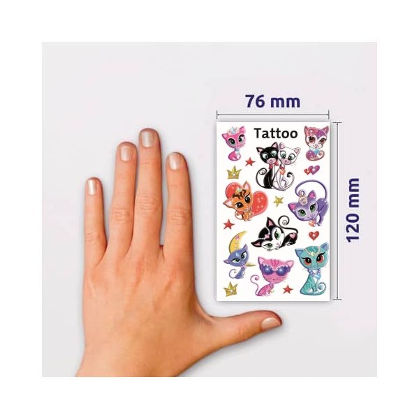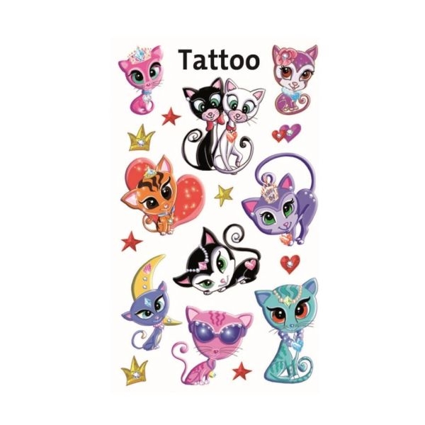 Τατουάζ με 16 γατούλες, καρδιές και αστέρια σε ένα φύλλο με διαφορετικά μεγέθη. Είναι κατάλληλο για μικρά παιδιά, καθώς είναι οικολογικά και αφαιρούνται εύκολα με νερό και σαπούνι!