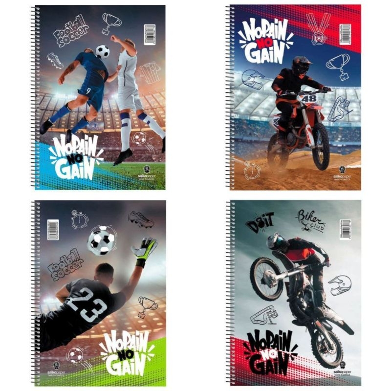 Τετράδιο σπιράλ 3 θέματα της σειράς Salkopaper με θέμα διάφορα αθλήματα. Διαθέτει εξώφυλλο από χαρτόνι και 90 ριγέ φύλλα.