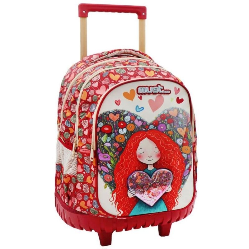 Σχολική Τσάντα Τρόλεϊ Δημοτικού Must Red Heart με 3 θήκες σε εντυπωσιακό σχέδιο κορίτσι με pvc καρδιά με πούλιες!
