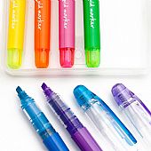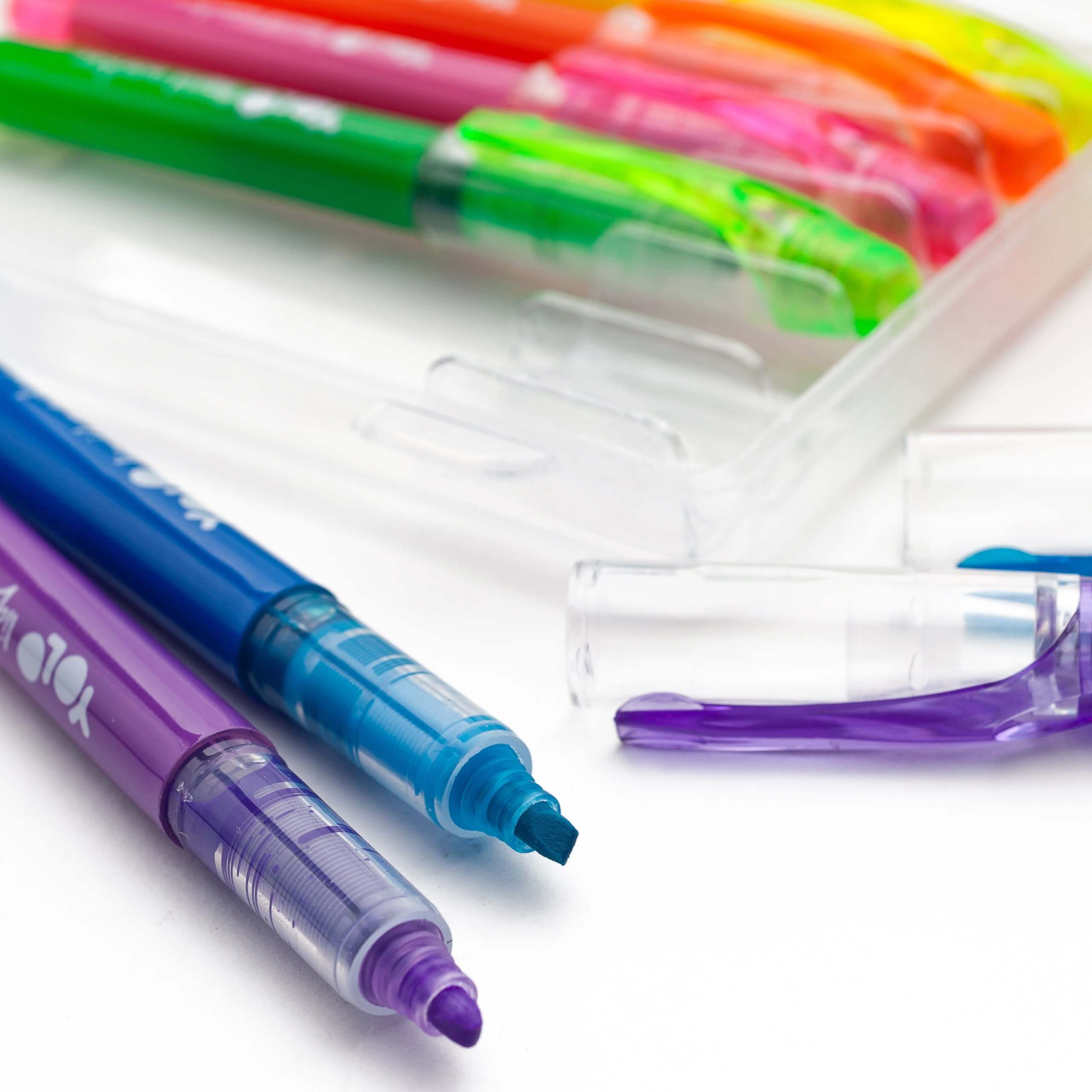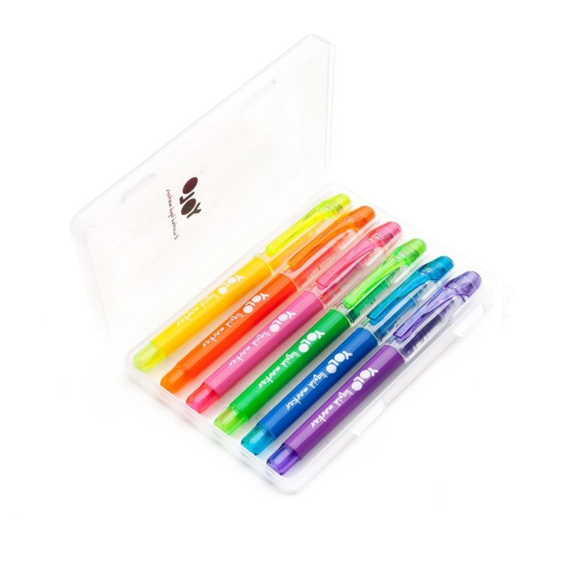 Έξι μαρκαδόροι υπογράμμισης υγρής μελάνης της YOLO μέσα σε διάφανη κασετίνα για να μην τα χάνεις με τίποτα!