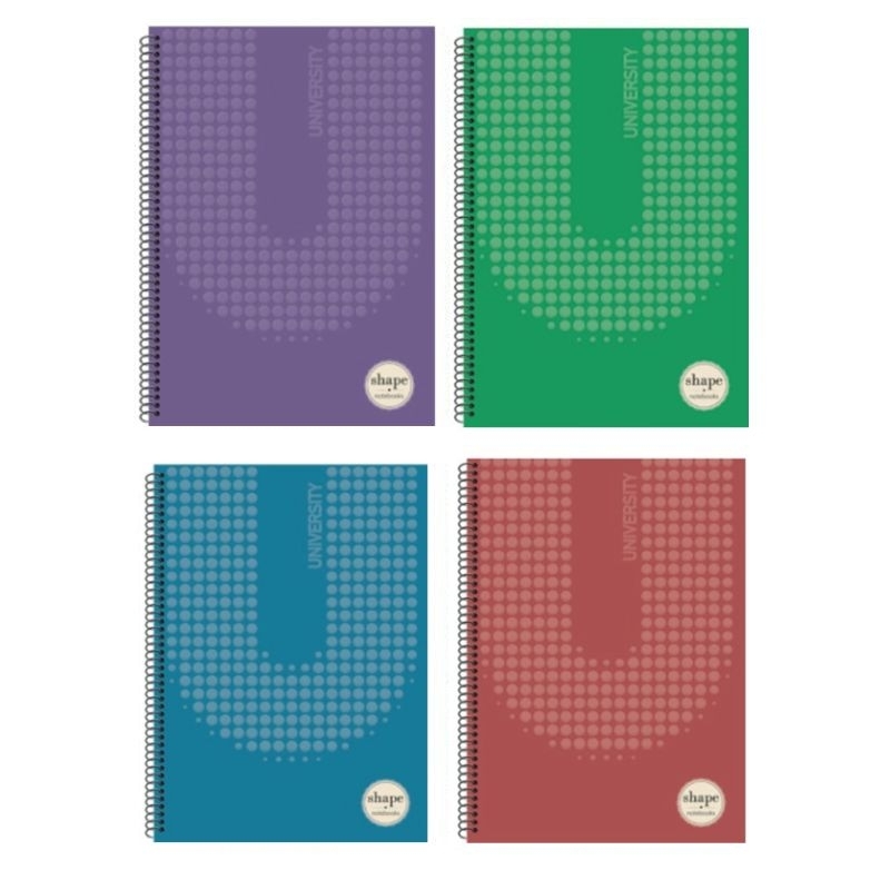 Τετράδιο σπιράλ 2 θεμάτων της σειράς University από την Shape σε 4 σχέδια. Διαθέτει εξώφυλλο από χαρτόνι και 60 ριγέ φύλλα 70gr.