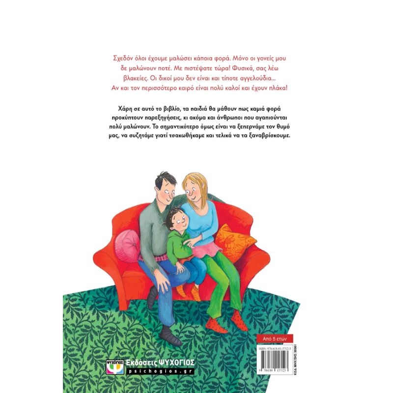 Σχεδόν όλοι έχουμε μαλώσει κάποια φορά. Μόνο οι γονείς μου δε μαλώνουν ποτέ. Με πιστέψατε τώρα! Φυσικά, σας λέω βλακείες. Οι δικοί μου δεν είναι και τίποτε αγγελούδια… Αν και τον περισσότερο καιρό είναι πολύ καλοί και έχουν πλάκα! Χάρη σε αυτό το βιβλίο, τα παιδιά θα μάθουν πως καμιά φορά προκύπτουν παρεξηγήσεις, κι ακόμα και άνθρωποι που αγαπιούνται πολύ μαλώνουν. Το σημαντικότερο όμως είναι να ξεπερνάμε τον θυμό μας, να συζητάμε γιατί τσακωθήκαμε και τελικά να τα ξαναβρίσκουμε.