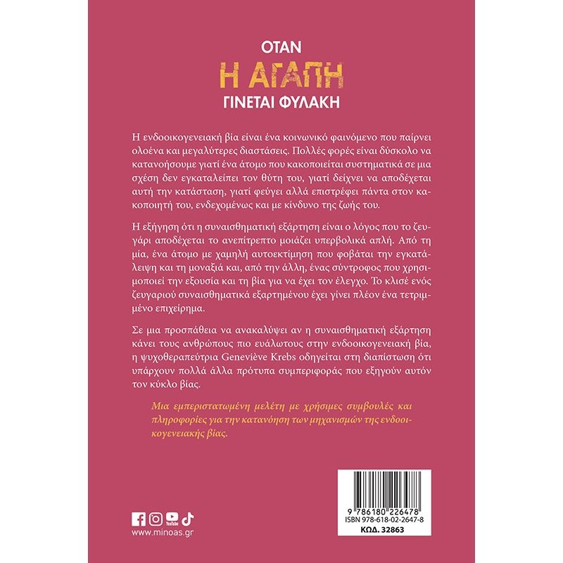 Η ενδοοικογενειακή βία είναι ένα κοινωνικό φαινόμενο που παίρνει ολοένα και μεγαλύτερες διαστάσεις. Πολλές φορές είναι δύσκολο να κατανοήσουμε γιατί ένα άτομο που κακοποιείται συστηματικά σε μια σχέση δεν εγκαταλείπει τον θύτη του, γιατί δείχνει να αποδέχεται αυτή την κατάσταση, γιατί φεύγει αλλά επιστρέφει πάντα στον κακοποιητή του, ενδεχομένως και με κίνδυνο της ζωής του. Η εξήγηση ότι η συναισθηματική εξάρτηση είναι ο λόγος που το ζευγάρι αποδέχεται το ανεπίτρεπτο μοιάζει υπερβολικά απλή. Από τη μία, ένα άτομο με χαμηλή αυτοεκτίμηση που φοβάται την εγκατάλειψη και τη μοναξιά και, από την άλλη, ένας σύντροφος που χρησιμοποιεί την εξουσία και τη βία για να έχει τον έλεγχο. Το κλισέ ενός ζευγαριού συναισθηματικά εξαρτημένου έχει γίνει πλέον ένα τετριμμένο επιχείρημα. Σε μια προσπάθεια να ανακαλύψει αν η συναισθηματική εξάρτηση κάνει τους ανθρώπους πιο ευάλωτους στην ενδοοικογενειακή βία, η ψυχοθεραπεύτρια Geneviève Krebs οδηγείται στη διαπίστωση ότι υπάρχουν πολλά άλλα πρότυπα συμπεριφοράς που εξηγούν αυτόν τον κύκλο βίας. Μια εμπεριστατωμένη μελέτη με χρήσιμες συμβουλές και πληροφορίες για την κατανόηση των μηχανισμών της ενδοοικογενειακής βίας.