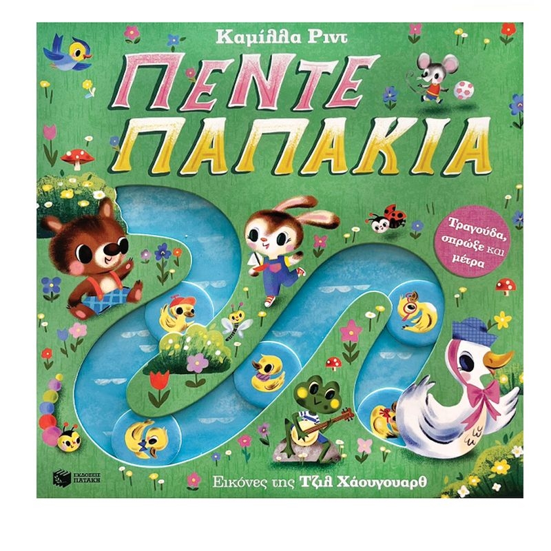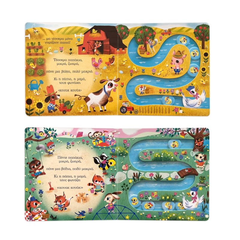 Πέντε παπάκια, μικρά, ζωηρά, πάνε μια βόλτα, πολύ μακριά. Μια όμορφη, διαδραστική εκδοχή του πασίγνωστου παιδικού τραγουδιού, ιδανική για παιδιά από 3 ετών. Ο ιδανικός τρόπος για να μάθει το παιδί να μετρά αντίστροφα, έχοντας στα χέρια του το βιβλίο αυτό από χαρτόνι, χρησιμοποιώντας τα δάχτυλά του και σπρώχνοντας κάθε φορά ένα ένα τα παπάκια στο νερό.