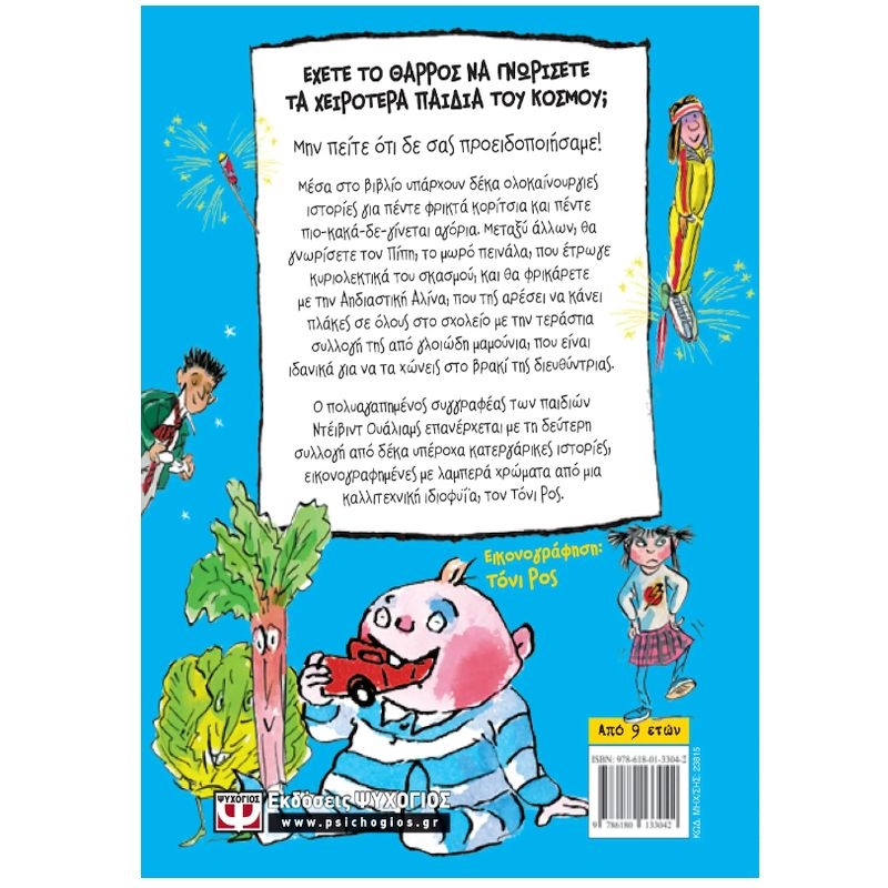 ΕΧΕΤΕ ΤΟ ΘΑΡΡΟΣ ΝΑ ΓΝΩΡΙΣΕΤΕ ΤΑ ΧΕΙΡΟΤΕΡΑ ΠΑΙΔΙΑ ΤΟΥ ΚΟΣΜΟΥ; Μην πείτε ότι δε σας προειδοποιήσαμε! Μέσα στο βιβλίο υπάρχουν δέκα ολοκαίνουργιες ιστορίες για πέντε φρικτά κορίτσια και πέντε πιο-κακά-δε-γίνεται αγόρια. Μεταξύ άλλων, θα γνωρίσετε τον Πίπη, το μωρό πεινάλα, που έτρωγε κυριολεκτικά του σκασμού, και θα φρικάρετε με την Αηδιαστική Αλίνα, που της αρέσει να κάνει πλάκες σε όλους στο σχολείο με την τεράστια συλλογή της από γλοιώδη μαμούνια, που είναι ιδανικά για να τα χώνεις στο βρακί της διευθύντριας. Ο πολυαγαπημένος συγγραφέας των παιδιών Ντέιβιντ Ουάλιαμς επανέρχεται με τη δεύτερη συλλογή από δέκα υπέροχα κατεργάρικες ιστορίες, εικονογραφημένες με λαμπερά χρώματα από μια καλλιτεχνική ιδιοφυΐα, τον Τόνι Ρος.