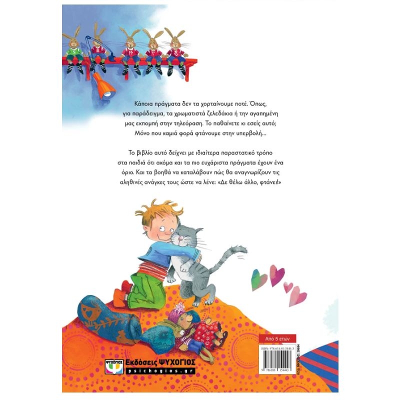 Το βιβλίο αυτό δείχνει με ιδιαίτερα παραστατικό τρόπο στα παιδιά ότι ακόμα και τα πιο ευχάριστα πράγματα έχουν ένα όριο. Και τα βοηθά να καταλάβουν πώς θα αναγνωρίζουν τις αληθινές ανάγκες τους ώστε να λένε: «Δε θέλω άλλο, φτάνει!».