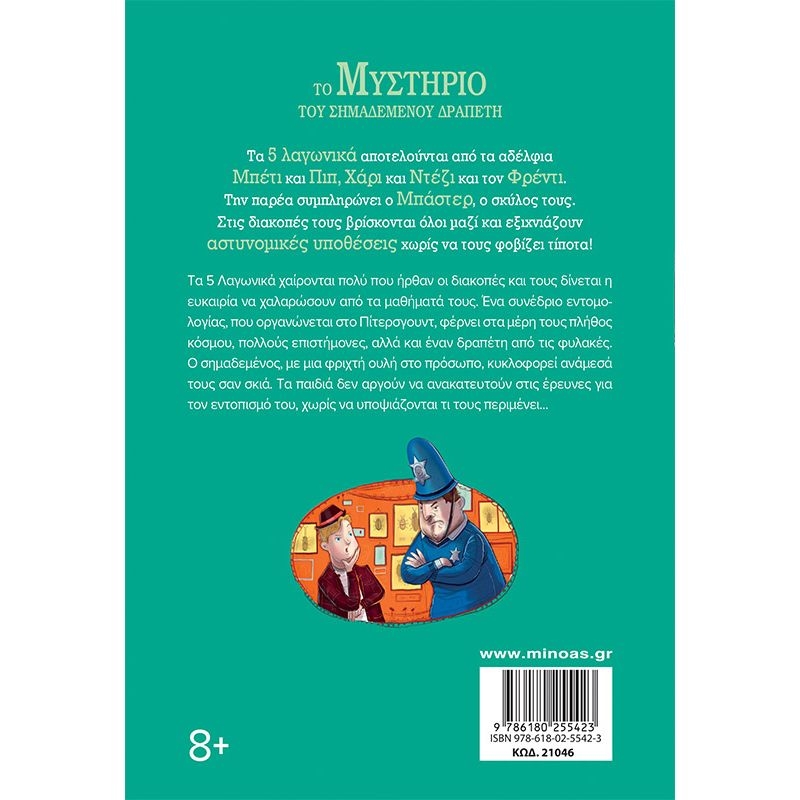 Τα 5 λαγωνικά αποτελούνται από τα αδέλφια Μπέτι και Πιπ, Χάρι και Ντέζι και τον Φρέντι. Την παρέα συμπληρώνει ο Μπάστερ, ο σκύλος τους. Στις διακοπές τους βρίσκονται όλοι μαζί και εξιχνιάζουν αστυνομικές υποθέσεις χωρίς να τους φοβίζει τίποτα! Τα 5 Λαγωνικά χαίρονται πολύ που ήρθαν οι διακοπές και τους δίνεται η ευκαιρία να χαλαρώσουν από τα μαθήματά τους. Ένα συνέδριο εντομολογίας, που οργανώνεται στο Πίτερσγουντ, φέρνει στα μέρη τους πλήθος κόσμου, πολλούς επιστήμονες, αλλά και έναν δραπέτη από τις φυλακές. Ο σημαδεμένος, με μια φριχτή ουλή στο πρόσωπο, κυκλοφορεί ανάμεσά τους σαν σκιά. Τα παιδιά δεν αργούν να ανακατευτούν στις έρευνες για τον εντοπισμό του, χωρίς να υποψιάζονται τι τους περιμένει…