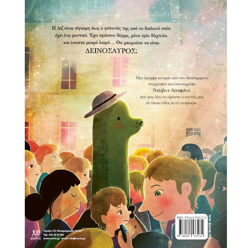 Η Λιζ είναι σίγουρη πως ο γείτονάς της από το διπλανό σπίτι έχει ένα μυστικό. Έχει πράσινο δέρμα, μόνο τρία δάχτυλα και ύποπτα μακρύ λαιμό… Θα μπορούσε να είναι ΔΕΙΝΟΣΑΥΡΟΣ; Μια όμορφη ιστορία από τον διακεκριμένο συγγραφέα και εικονογράφο Ντέιβιντ Λίτσφιλντ, που μας λέει να είμαστε ο εαυτός μας σε όποιο είδος και αν ανήκουμε.
