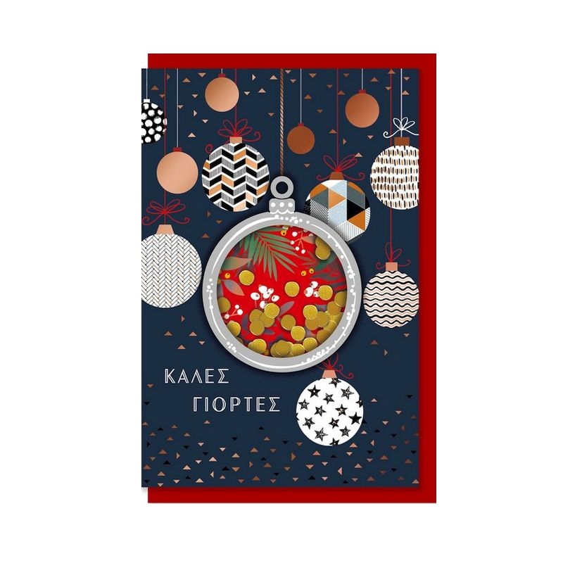 Χριστουγεννιάτικη ευχετήρια κάρτα με κομφετί glitter μπαλίτσες και σχέδιο μπάλες, με λεκτικό "Καλές γιόρτες" και χώρο μέσα στην κάρτα για να αναπτύξετε τις ευχές σας. Είτε πρόκειται για δώρο είτε για ατομική παρουσίαση αυτήν την κάρτα θα την θυμόμαστε!