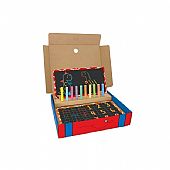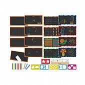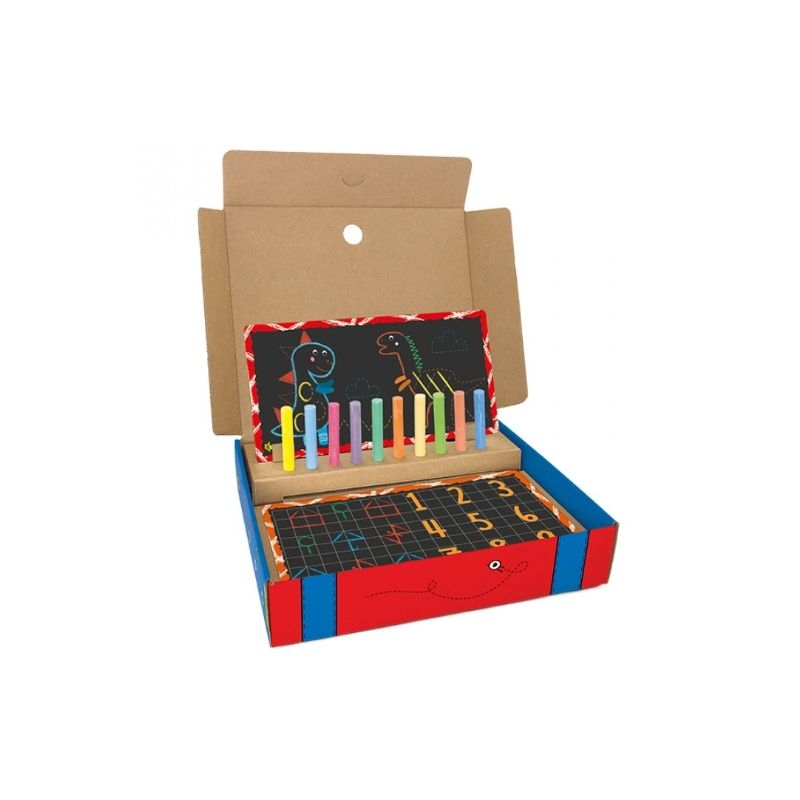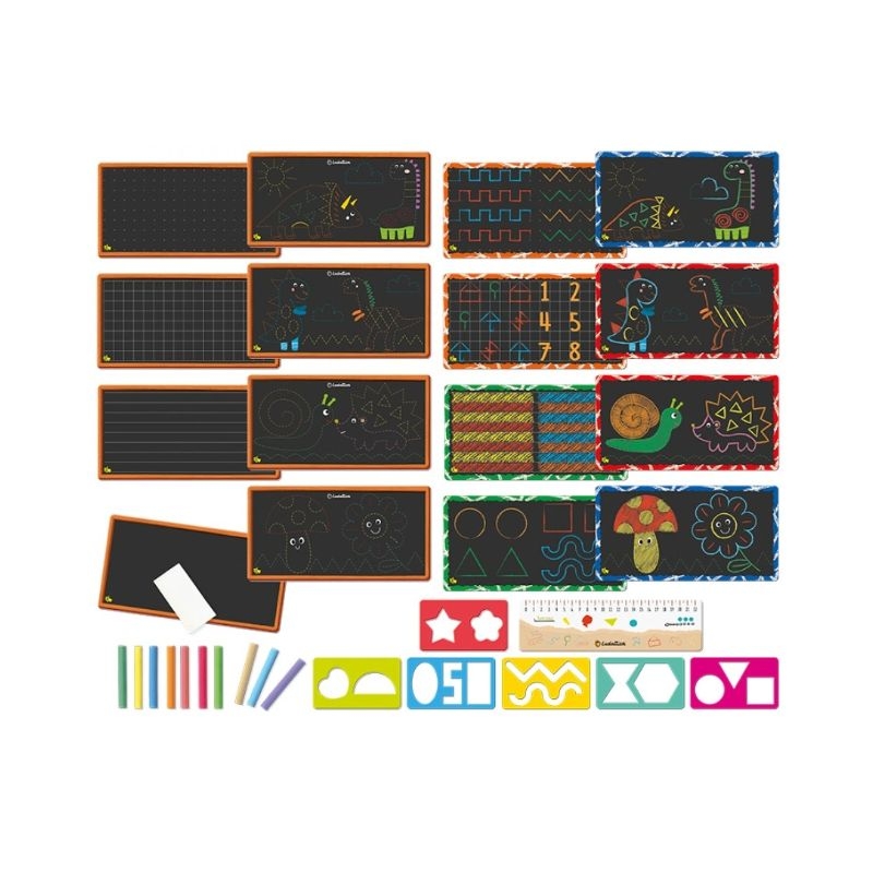 Περιλαμβάνει: 4 μικροί μαυροπίνακες, 10 χρωματιστές κιμωλίες, 1 σβήστρα, 1 χάρακας, στένσιλ, 4 επεξηγηματικές κιμωλίες και οδηγίες στα ελληνικά.