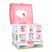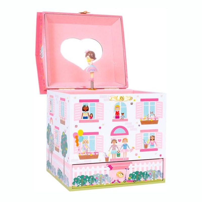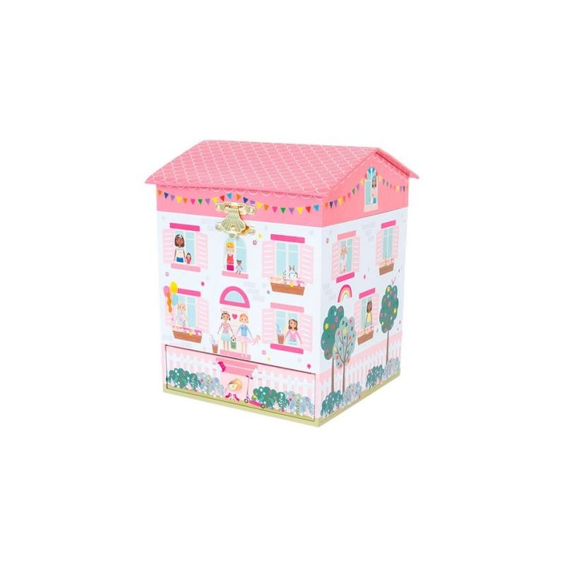 Η μουσική μπιζουτιέρα Κουκλόσπιτο είναι καλυμμένη με πανέμορφες απεικονίσεις! Διαθέτει έναν ενιαίο χώρο με βελούδινη επένδυση, ένα καθρεφτάκι σε σχήμα καρδιάς και μια κουκλίτσα που στριφογυρίζει. Το εύχρηστο συρτάρι είναι τέλειο για όλους τους θησαυρούς και τα μπιχλιμπίδια